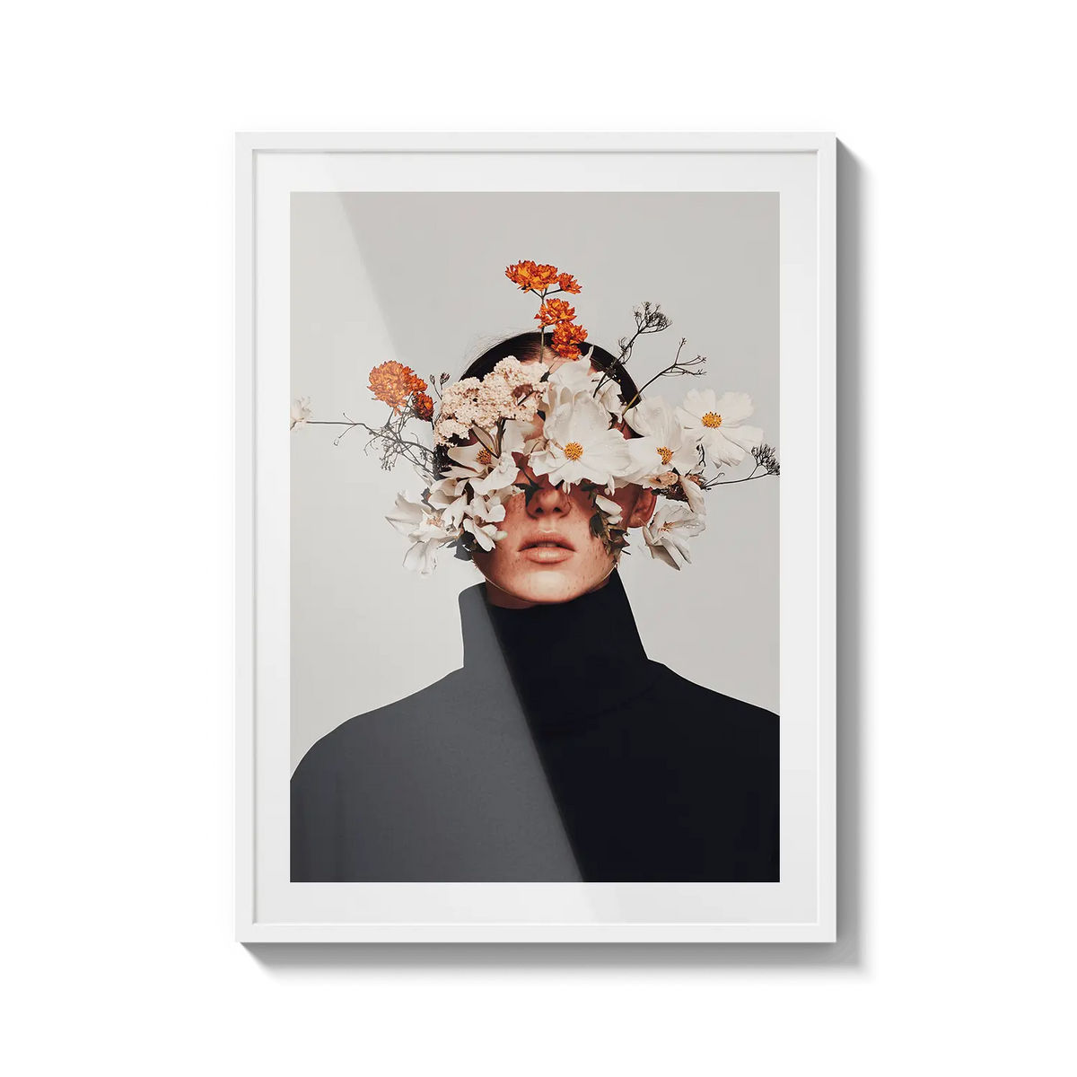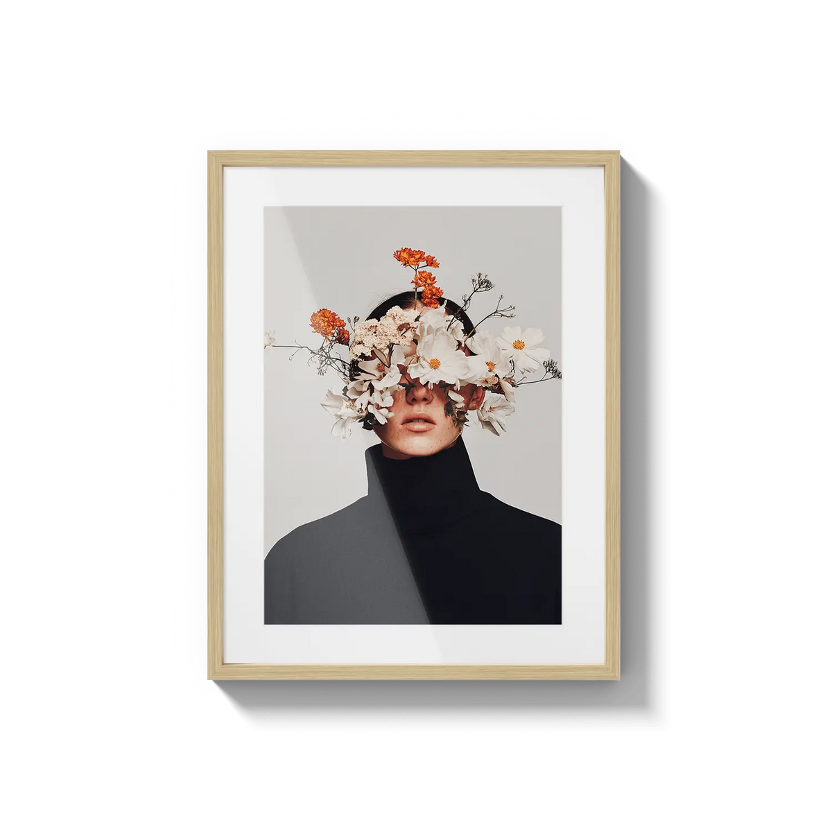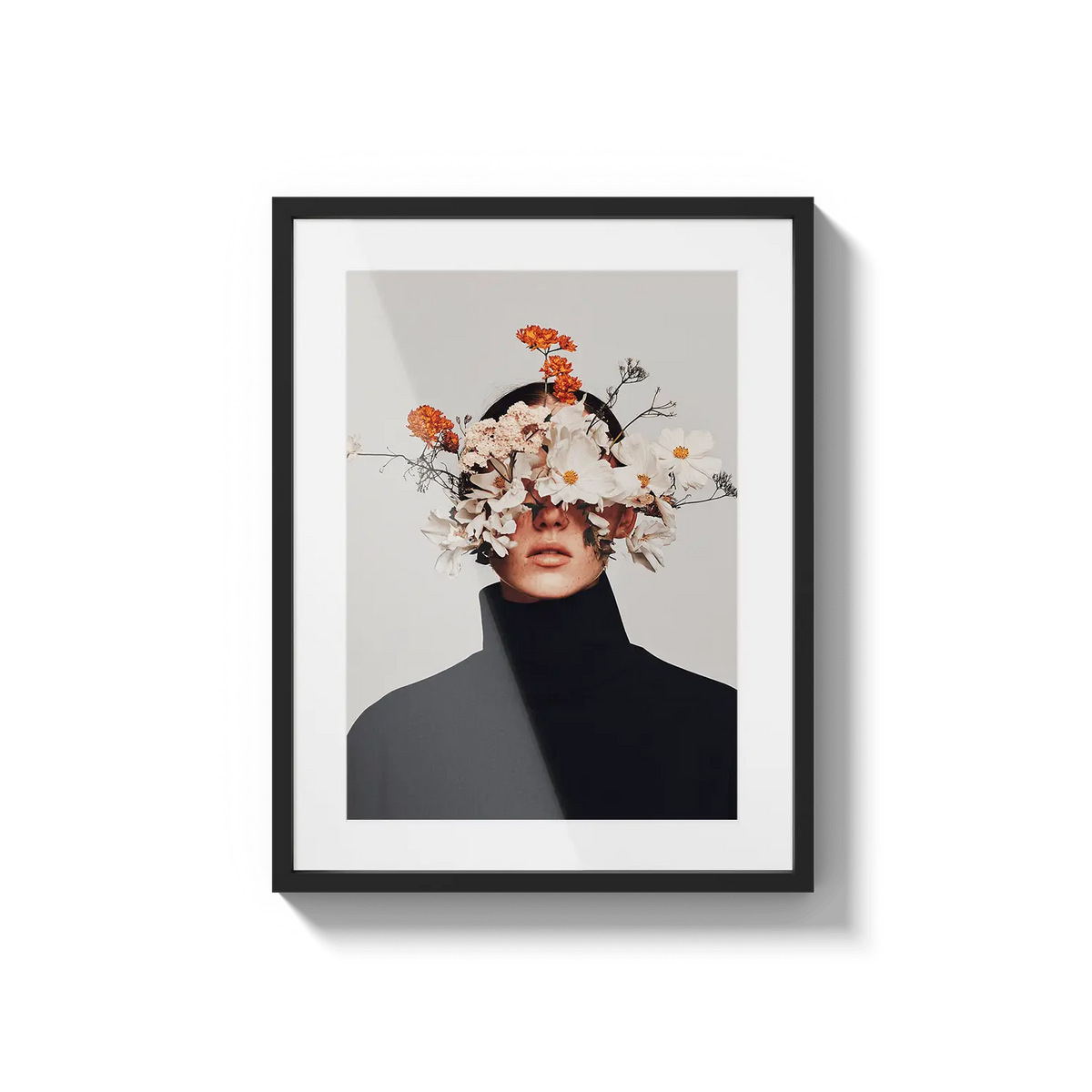 A serene portrait where flowers bloom softly around the face, blending stillness and imagination. A tender and expressive gift.