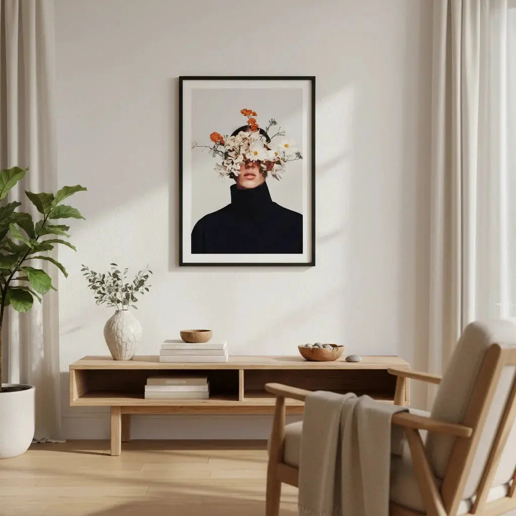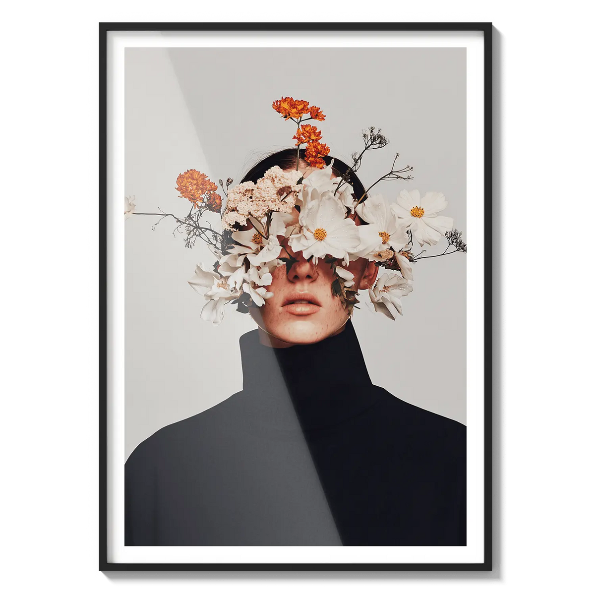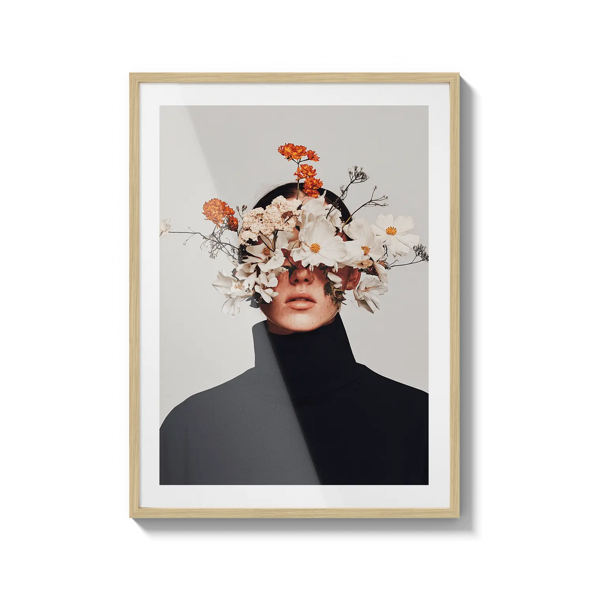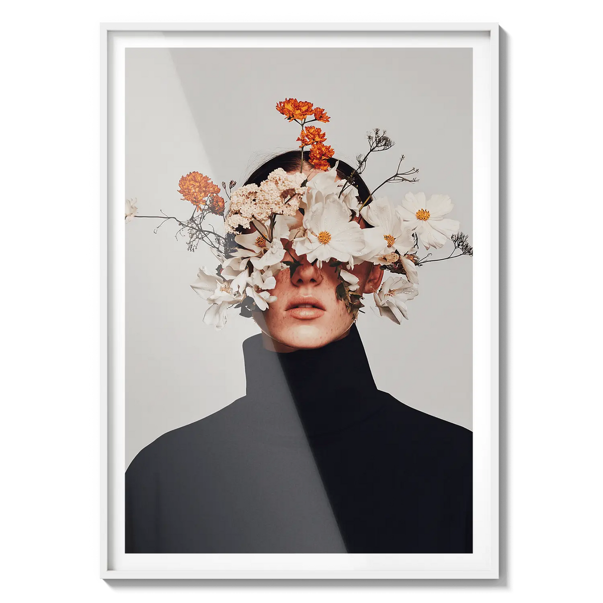 A serene portrait where flowers bloom softly around the face, blending stillness and imagination. A tender and expressive gift.
