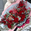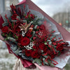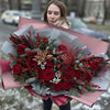 Buchetul conține 11 trandafiri roșii, 12 alstroemeria roșii, 4 ilex roșu, 4 leucadendron, 5 ramuri de fistic, 3 ramuri de brunia, o ramură mare de nobilis, un ananas decorativ, sparanghel, liliac și ambalaj decorativ.