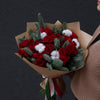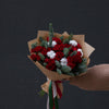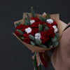 Buchetul conține 15 mini-trandafiri (miniroze) roșii, 2 fire de nobilis, 5 fire de bumbac și ambalaj decorativ.