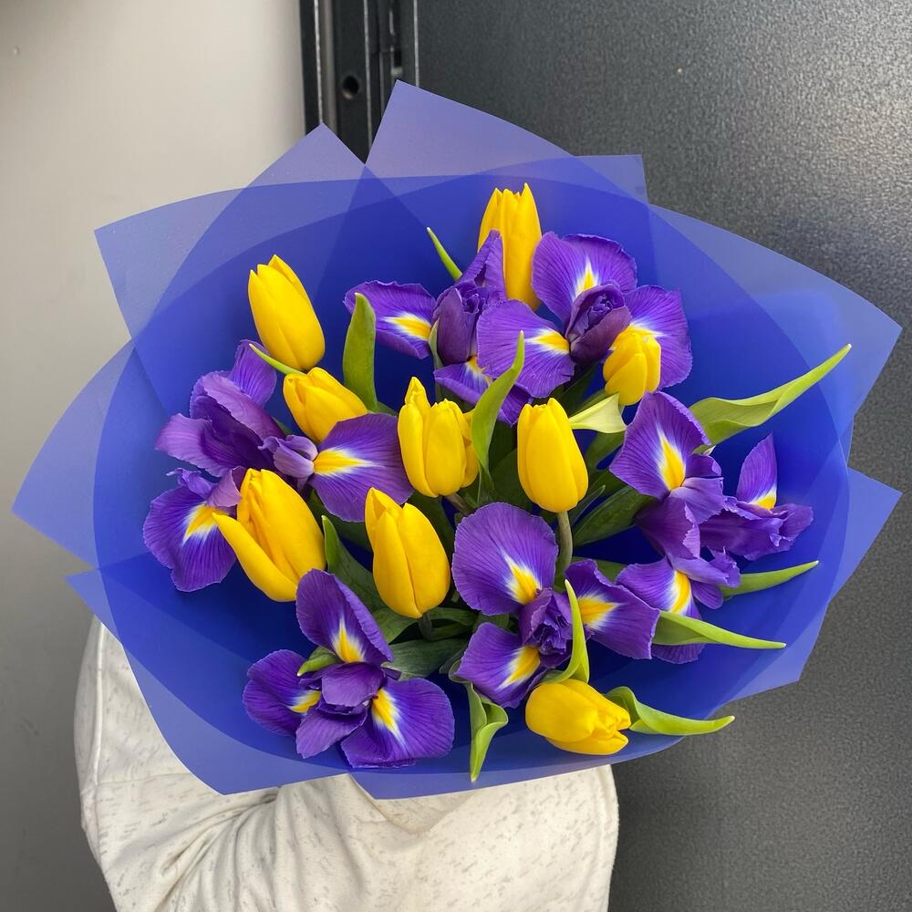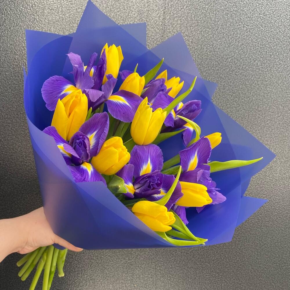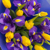 6 iriși mov, 9 lalele galbene in ambalaj albastru.
