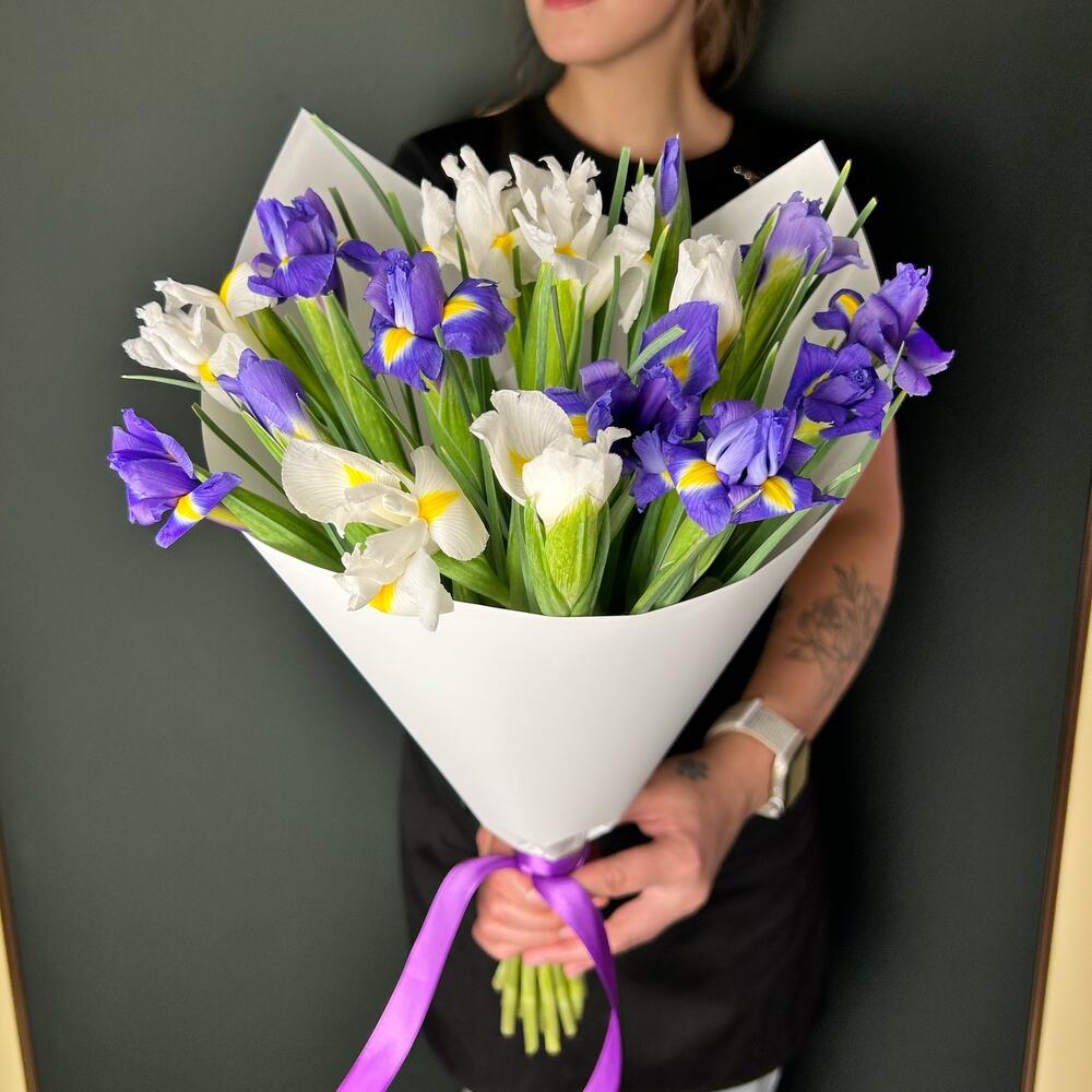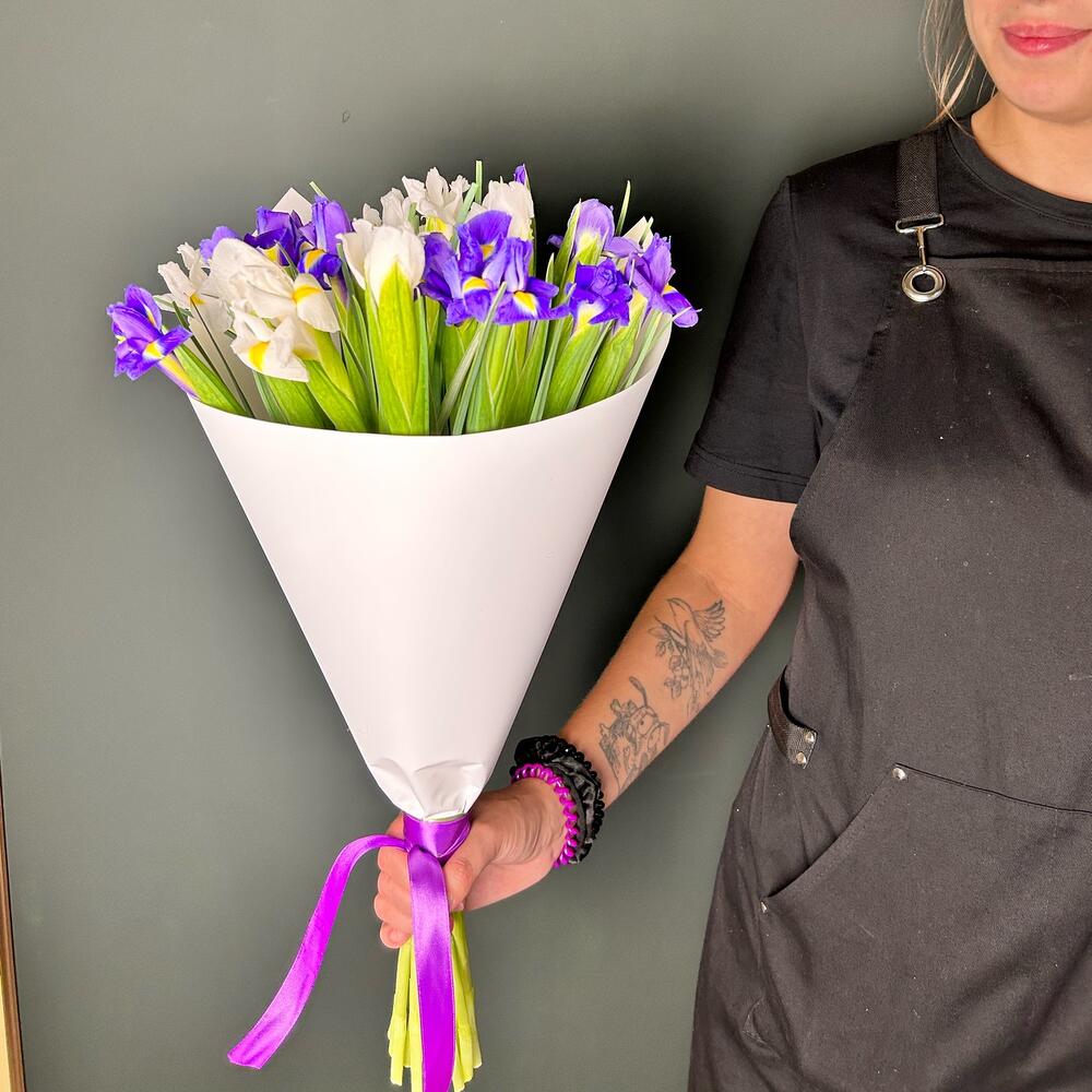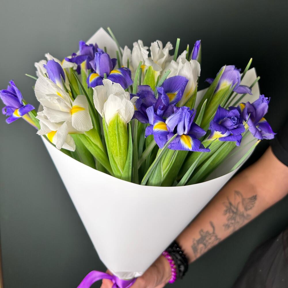 15 iriși alb-mov in ambalaj alb.