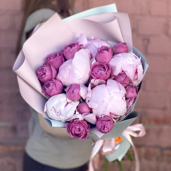 5 bujori roz, 6 trandafiri tross de gradina, ambalat.