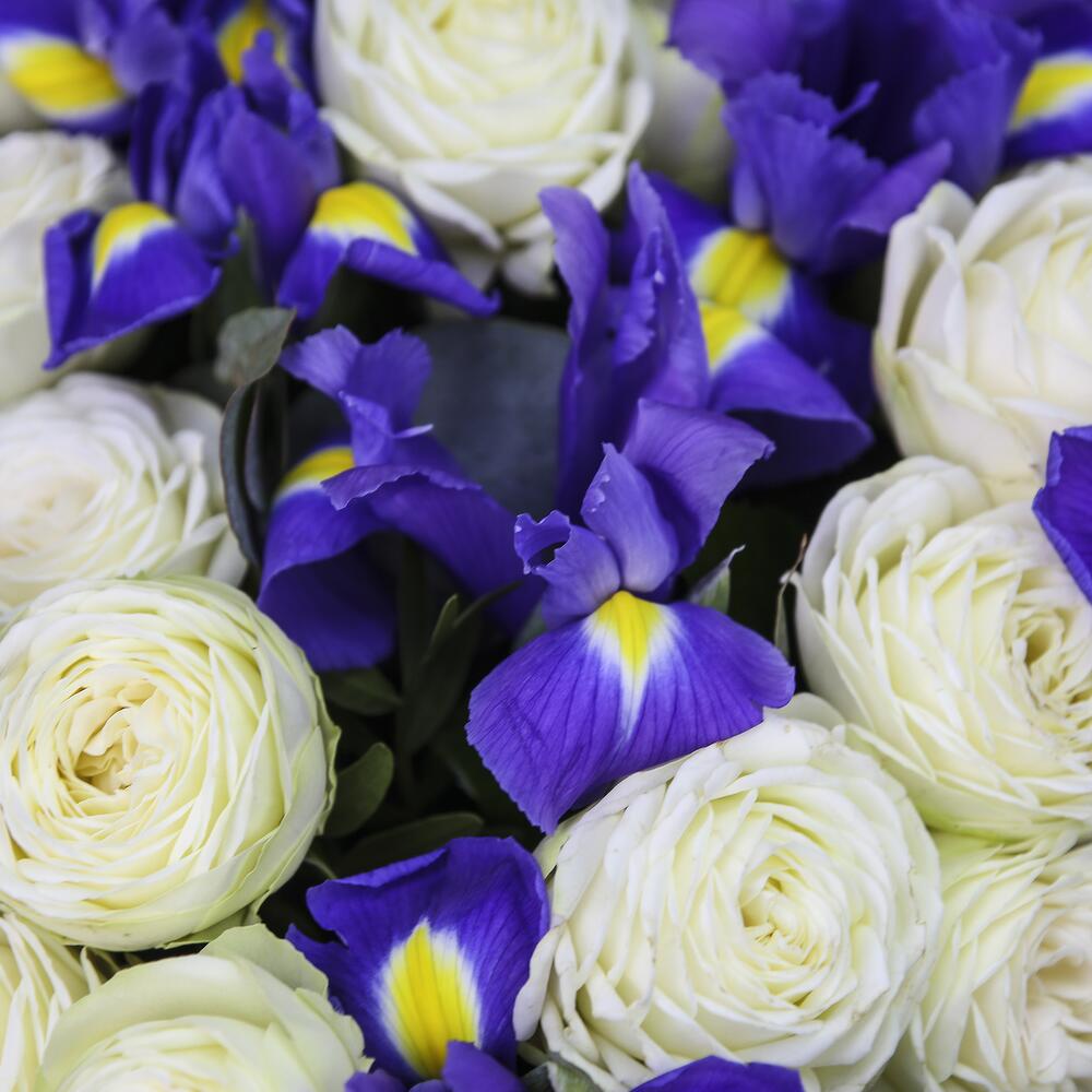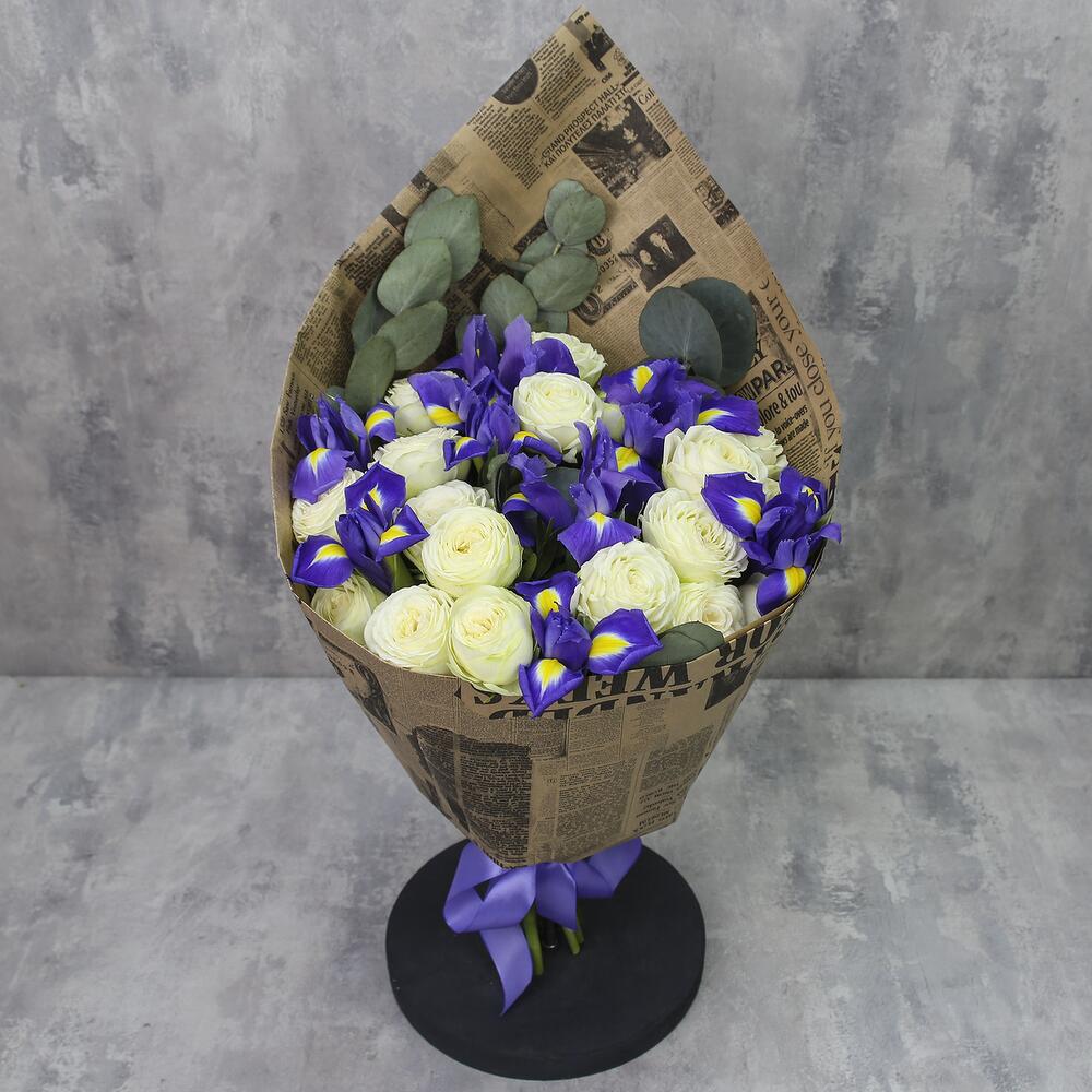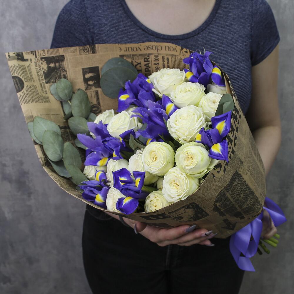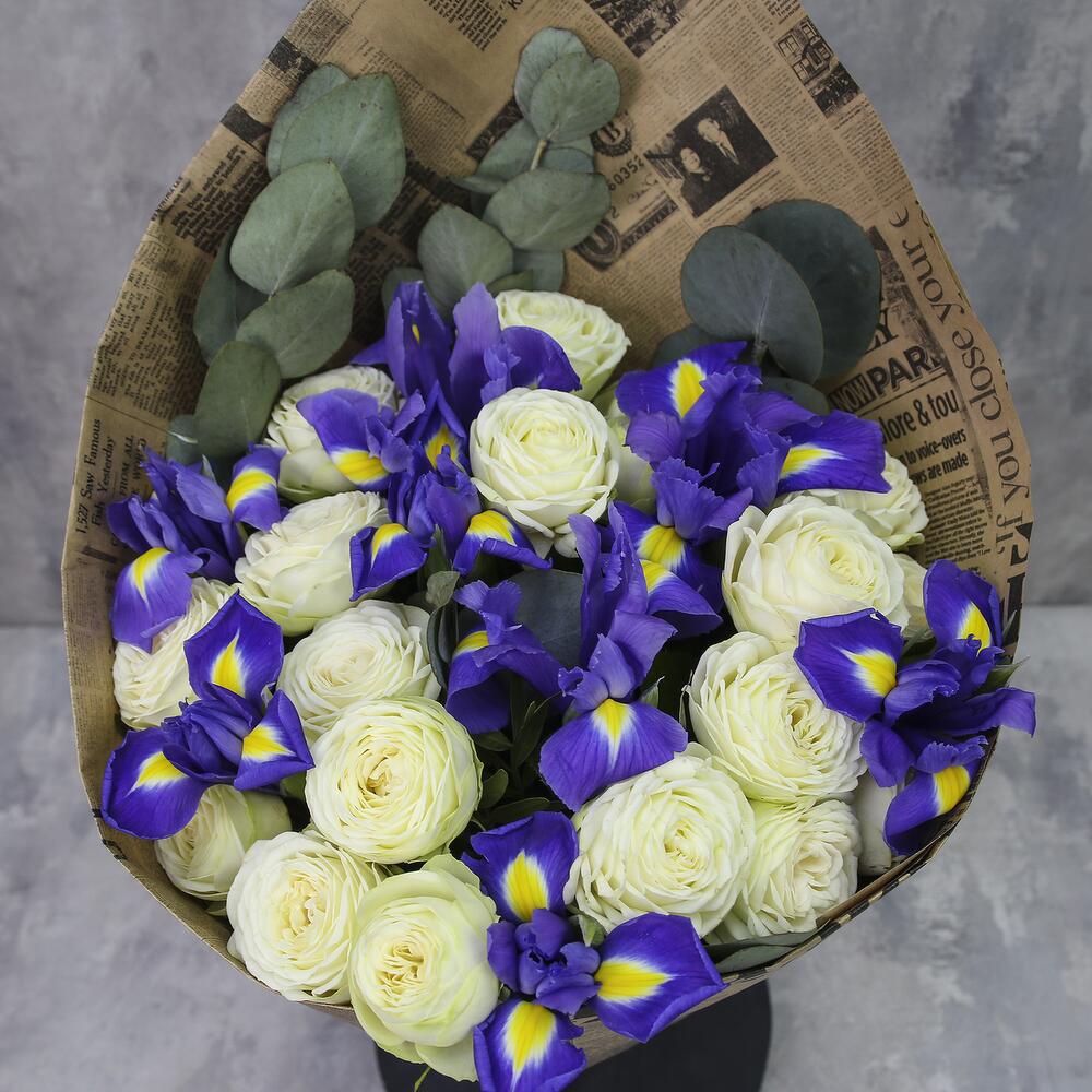 9 iriși, 15 trandafiri albi, eucalipt in hartie kraft.