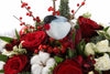 Buchetul conține: 5 bucăți Alstroemeria, 3 bucăți Hipericum, 1 bucată Ilex, 3 bucăți Nobilis, 5 bucăți Pitosporum, 5 bucăți Ranunculus, 5 bucăți Trandafir Roșu Paris (60 cm), 5 bucăți Trandafir Fulg de Zăpadă, 1 bucată decorațiune "Pasăre," 3 bucăți decorat pe băț, 1 bucată Bumbac, 1 bucată Minge de viță de vie (mică) și 3 bucăți Bal de Anul Nou.