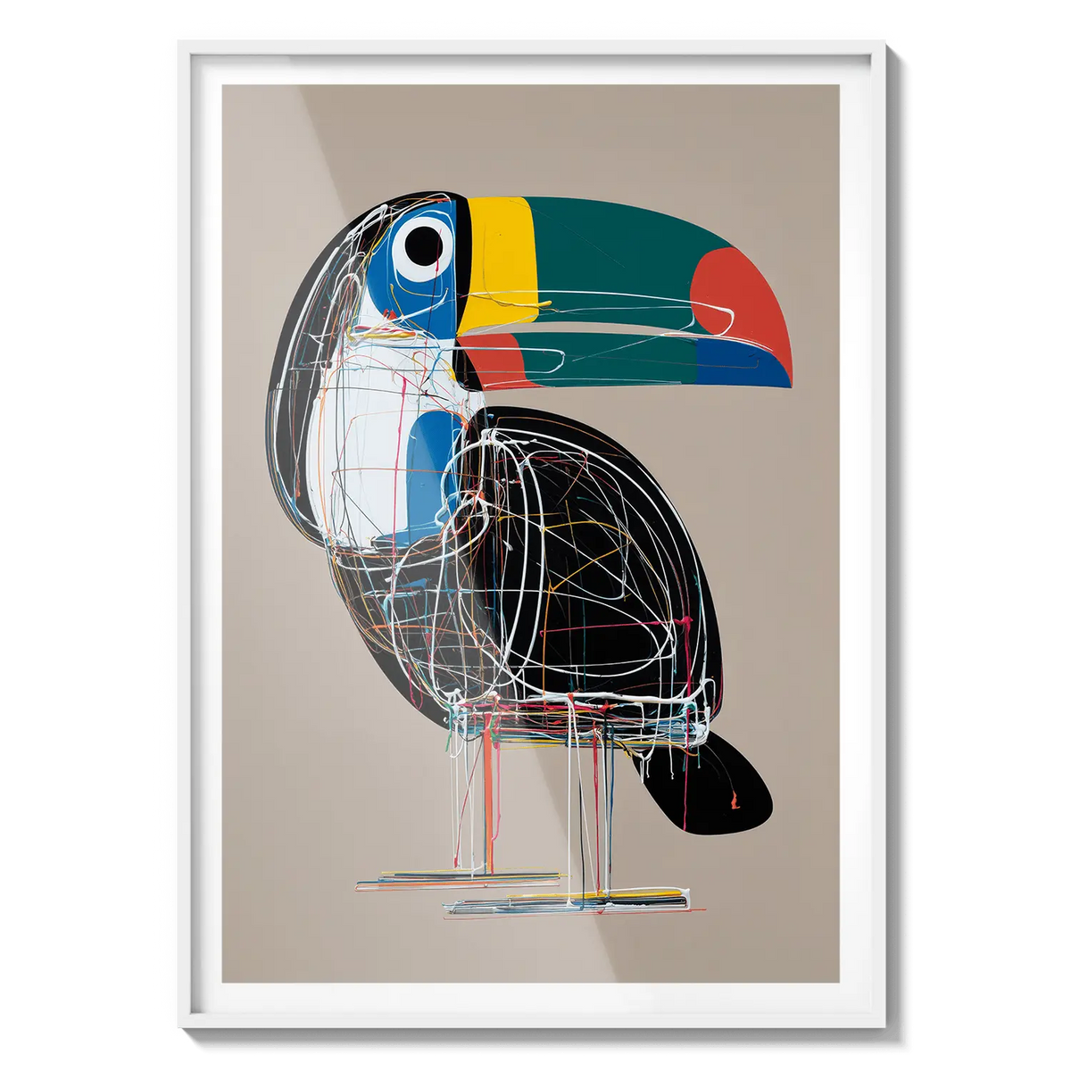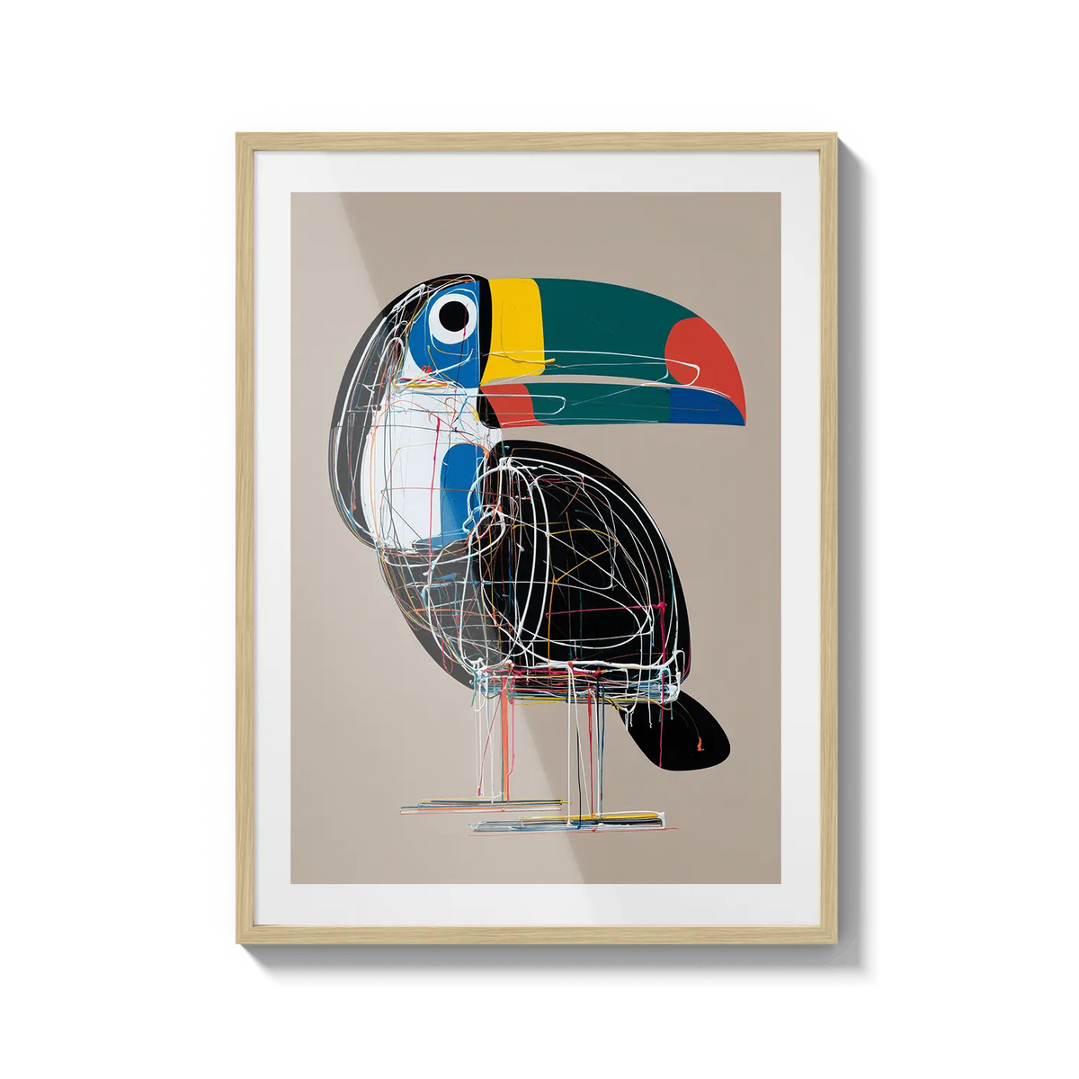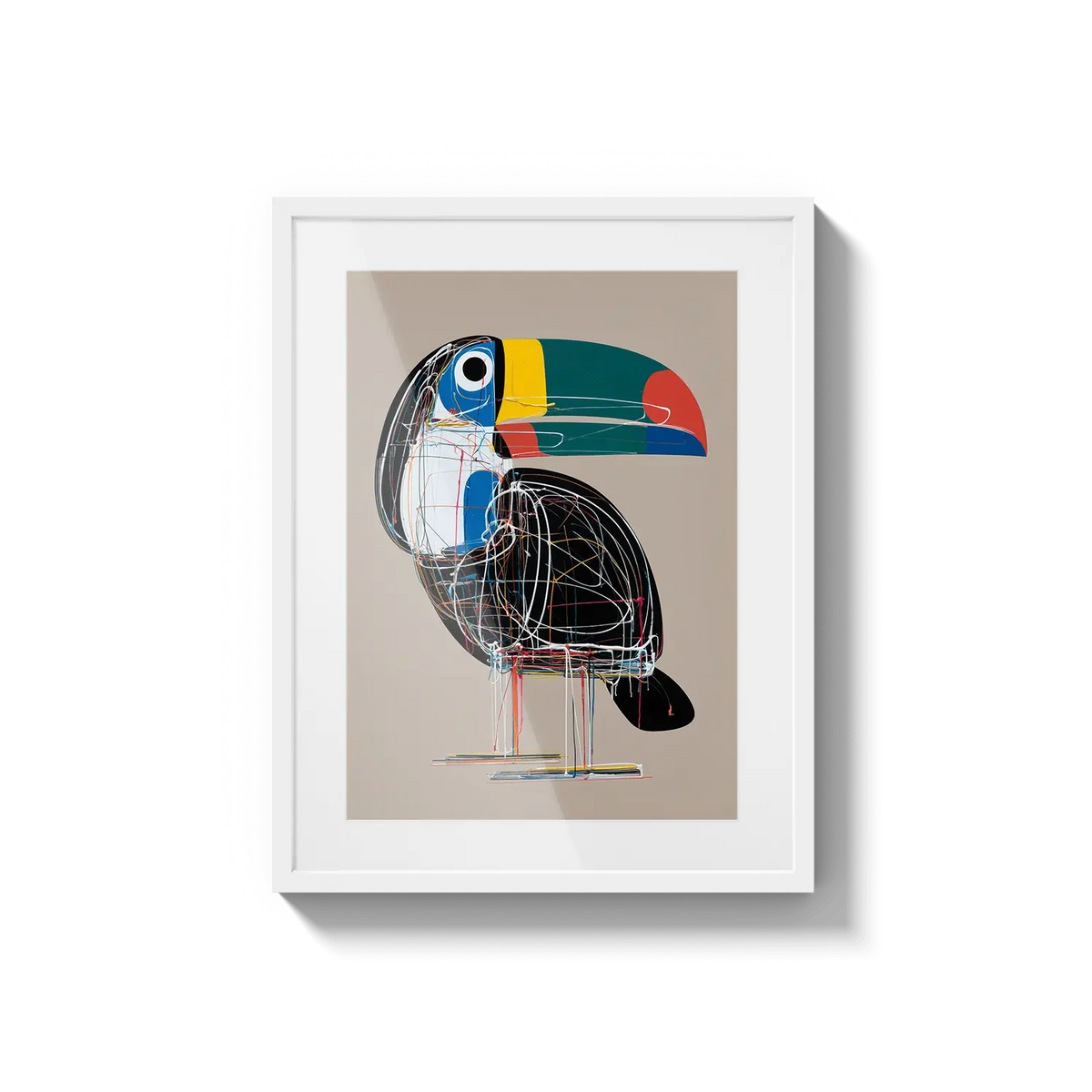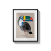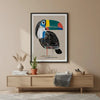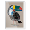 A bold toucan illustrated with geometric lines and bright tones, offering a modern and cheerful presence. A unique gift filled with character.