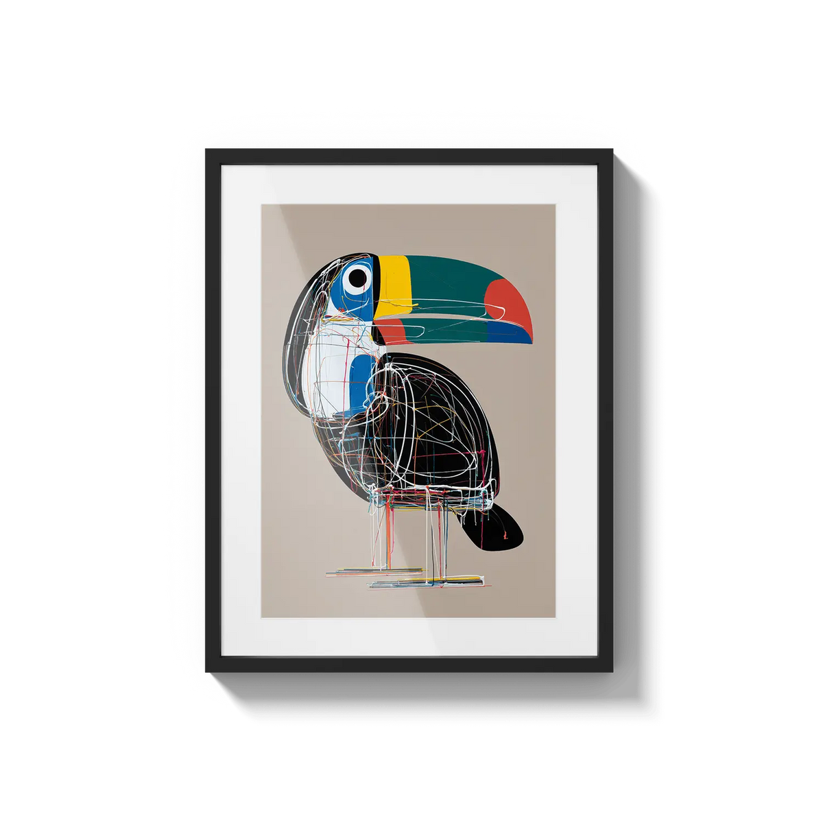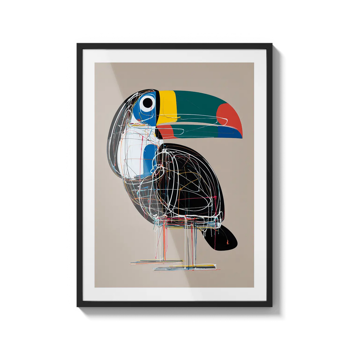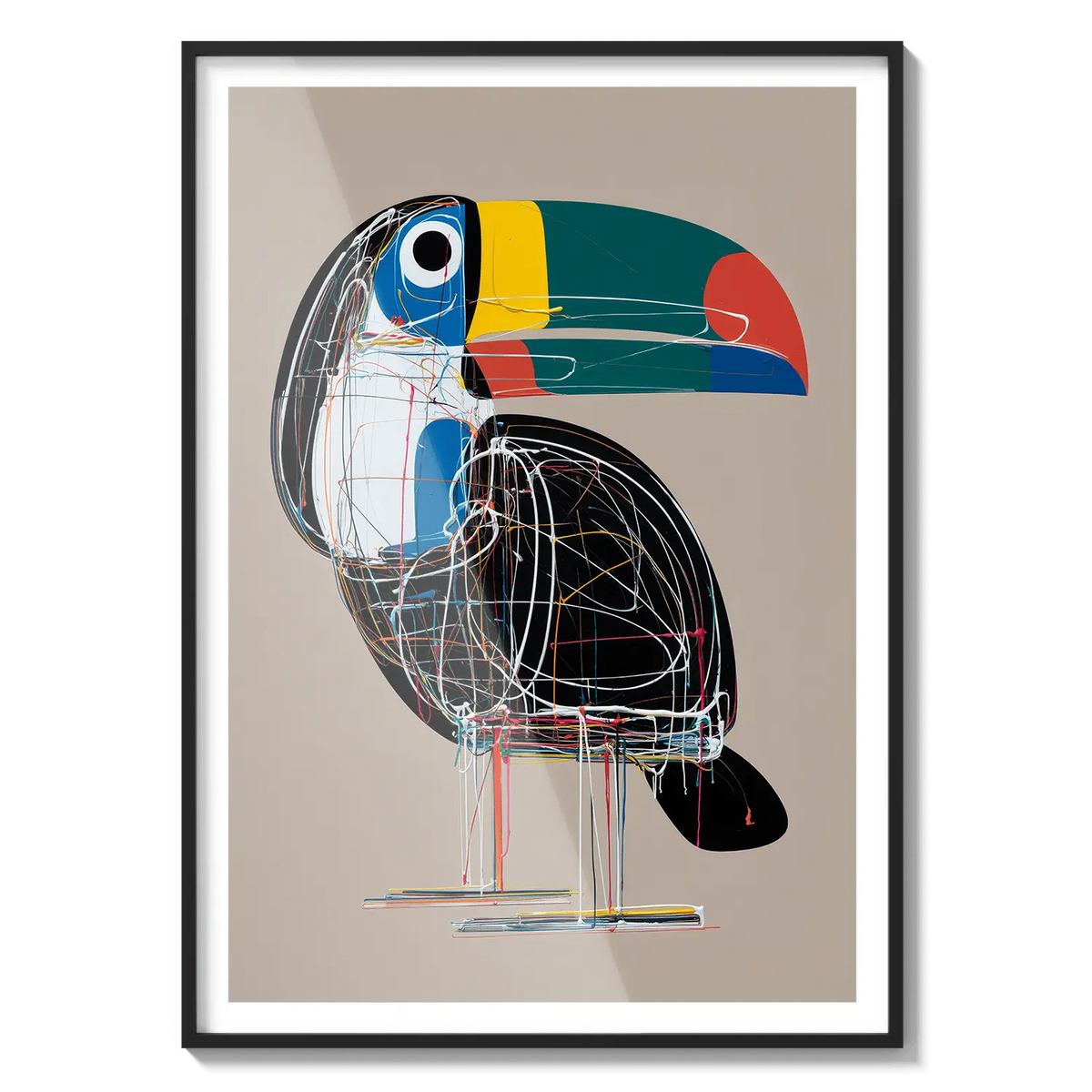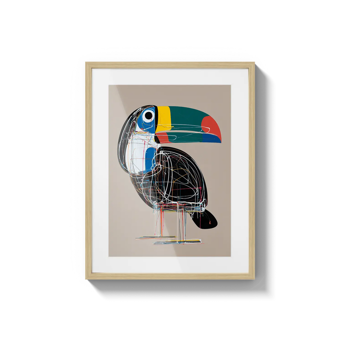 A bold toucan illustrated with geometric lines and bright tones, offering a modern and cheerful presence. A unique gift filled with character.