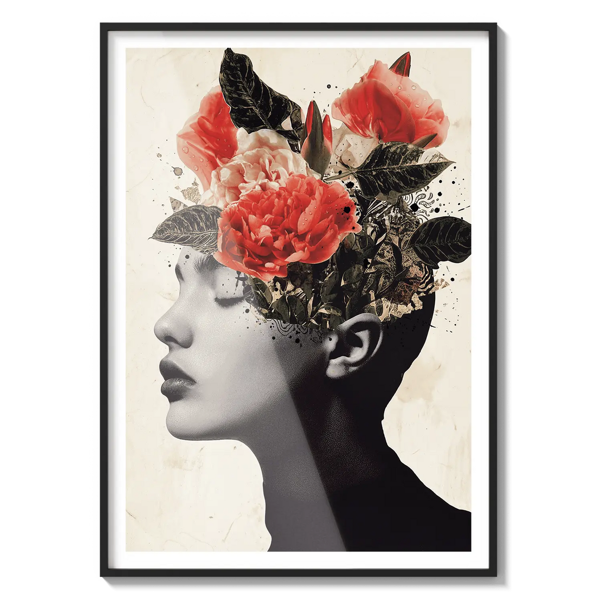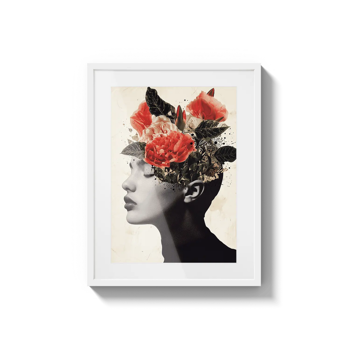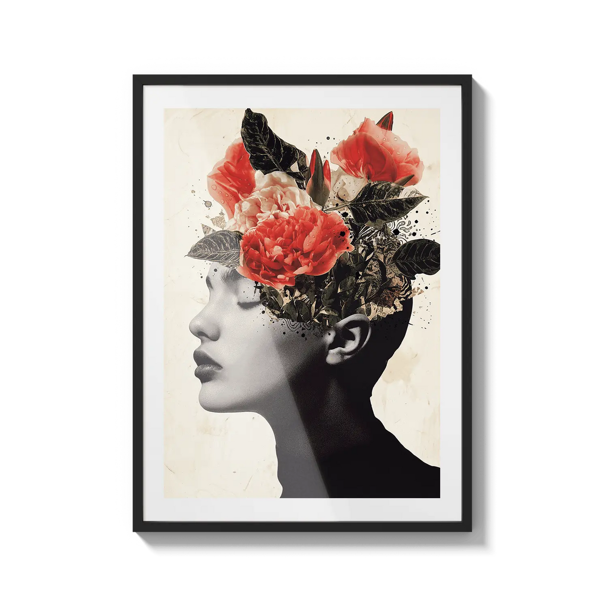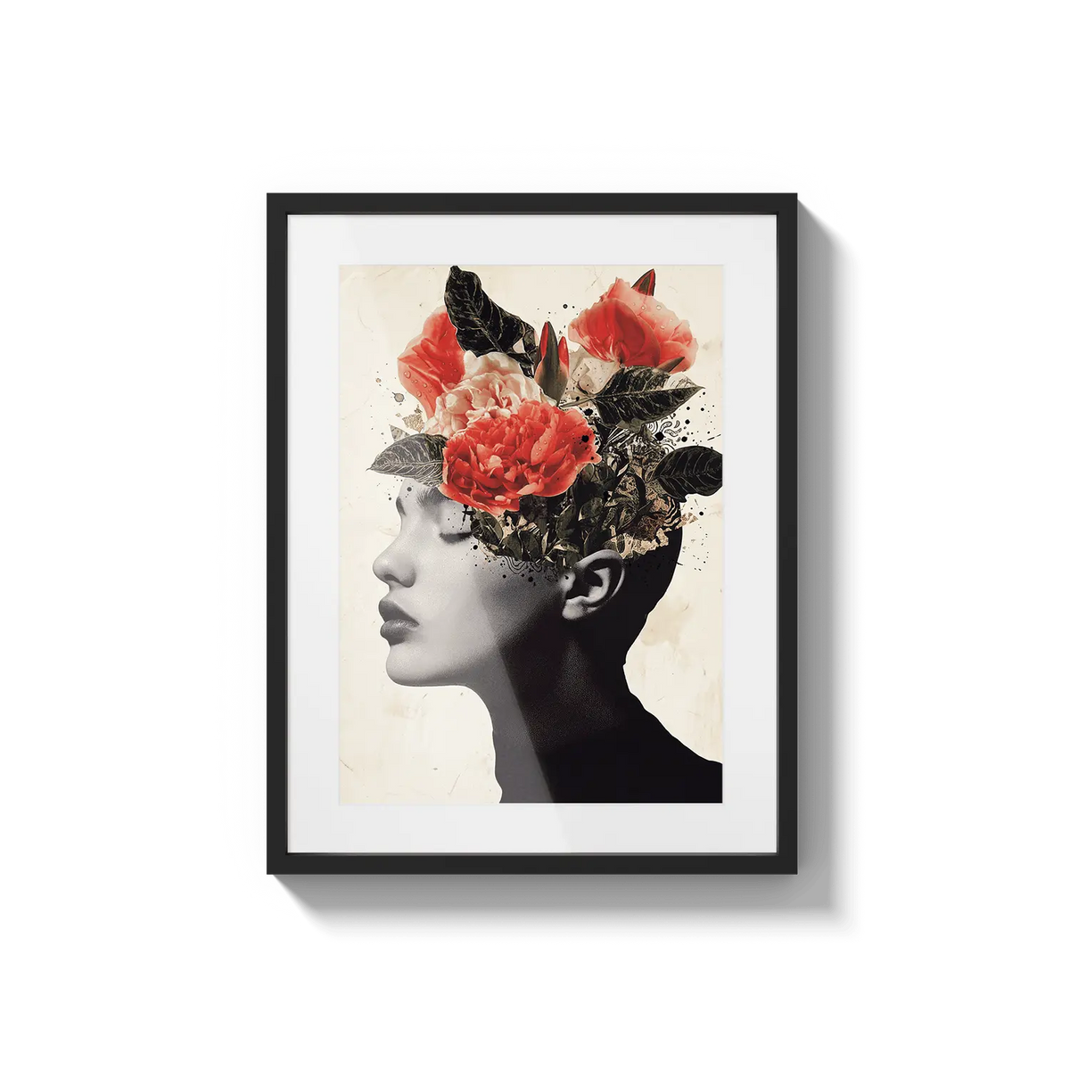 A poetic black-and-white portrait with vivid flowers, merging emotion and artistry. A sophisticated gift with quiet strength.