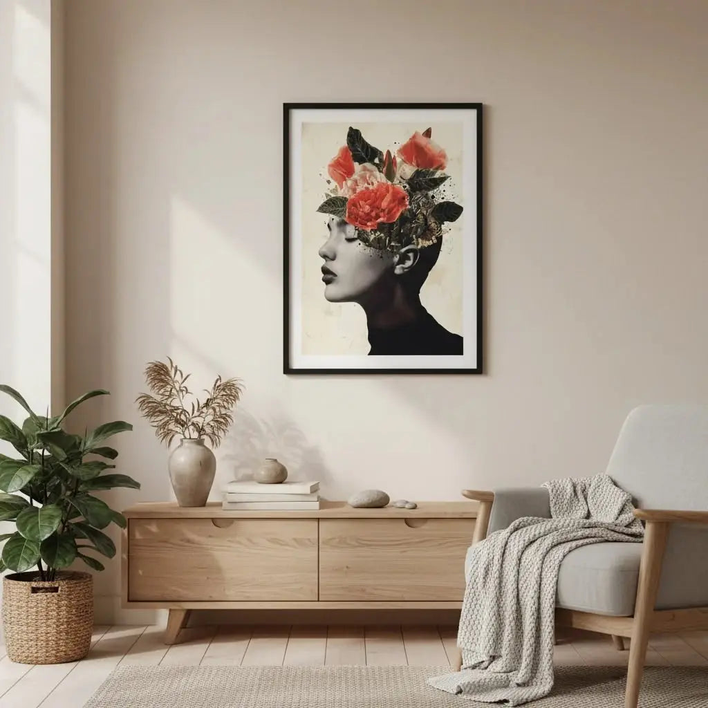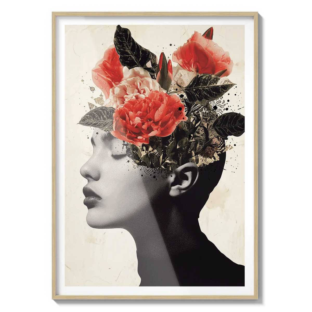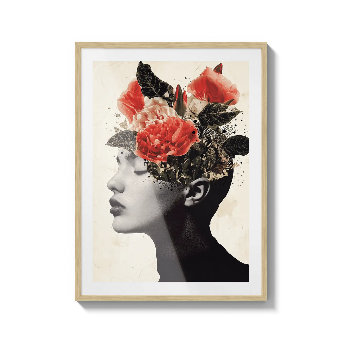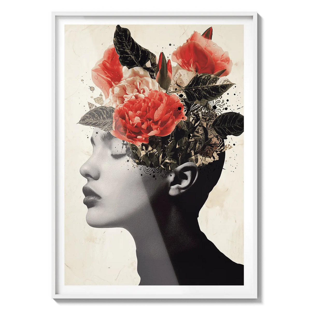 A poetic black-and-white portrait with vivid flowers, merging emotion and artistry. A sophisticated gift with quiet strength.