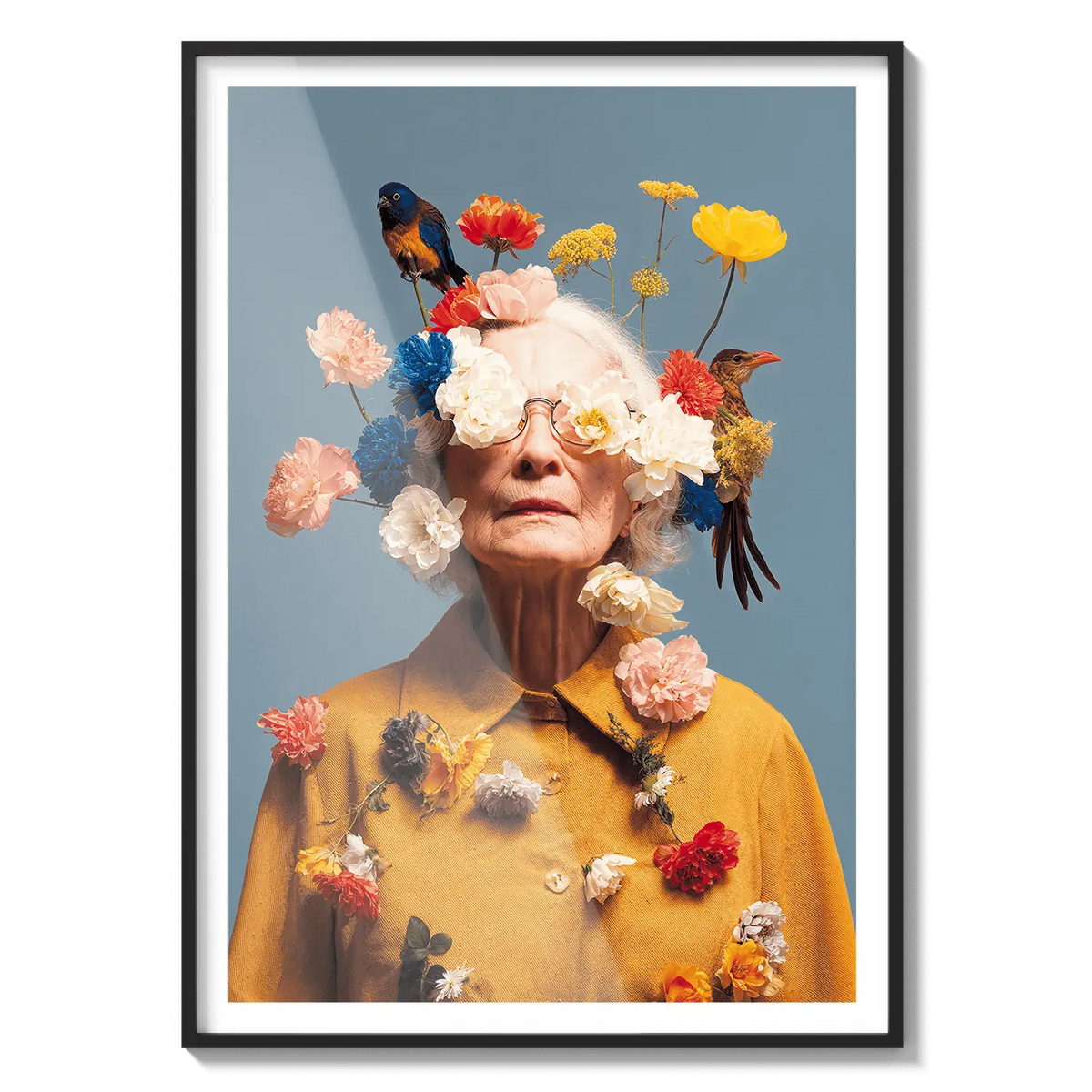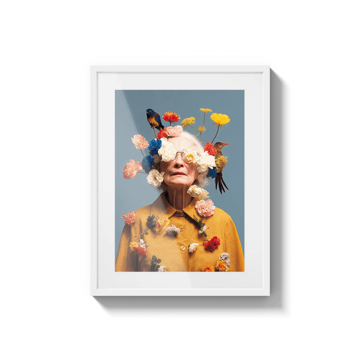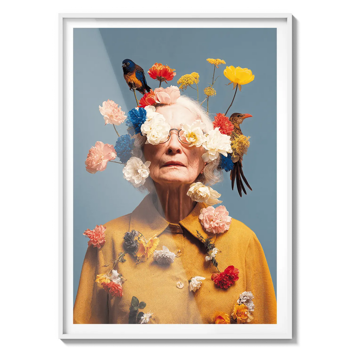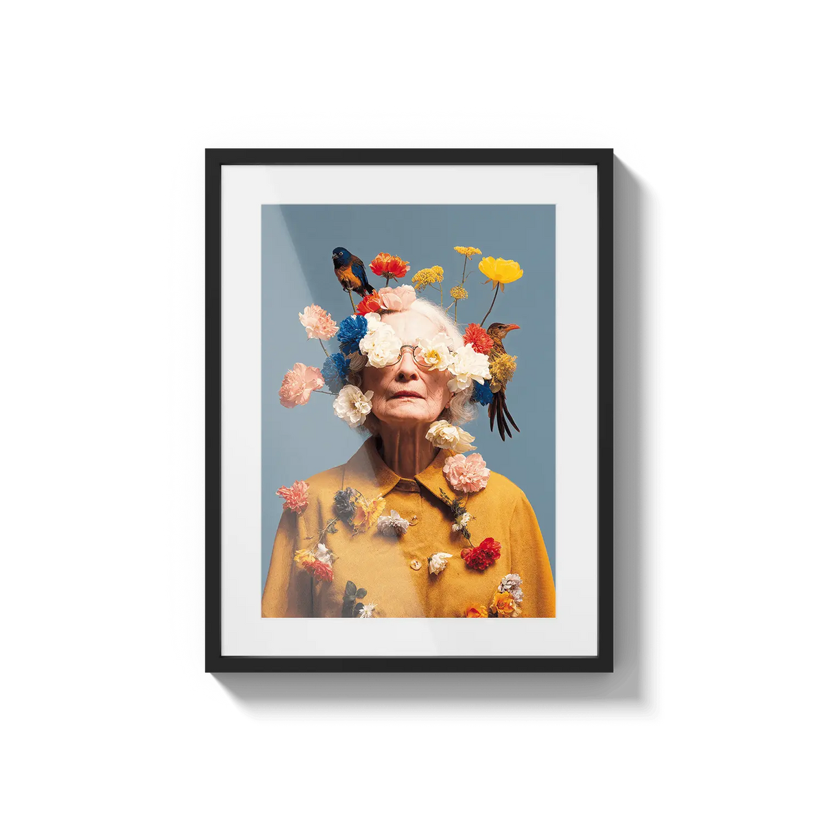 A portrait of an older woman adorned with blooming flowers, celebrating beauty, wisdom and grace. A thoughtful and uplifting gesture.