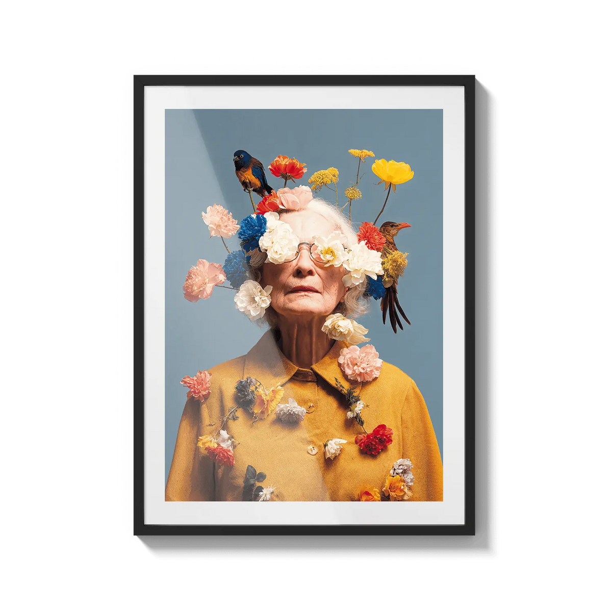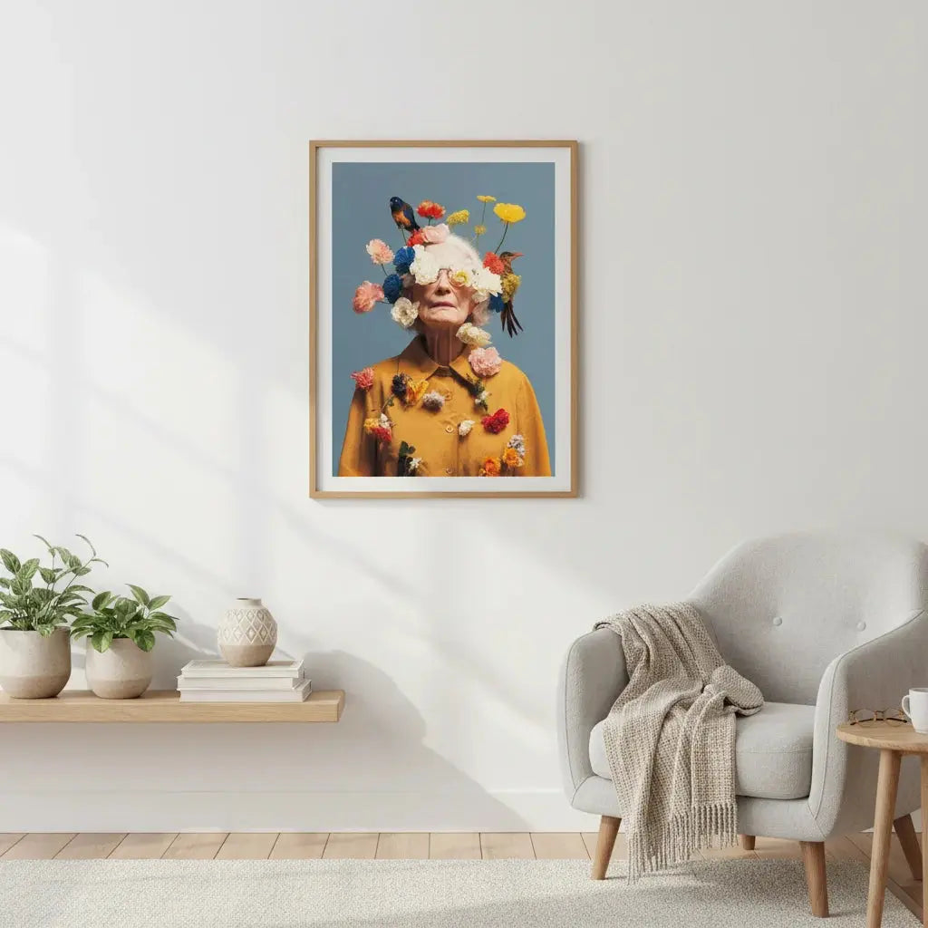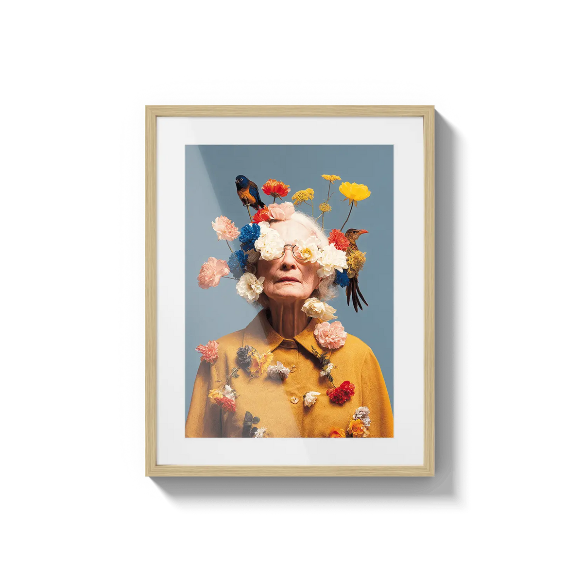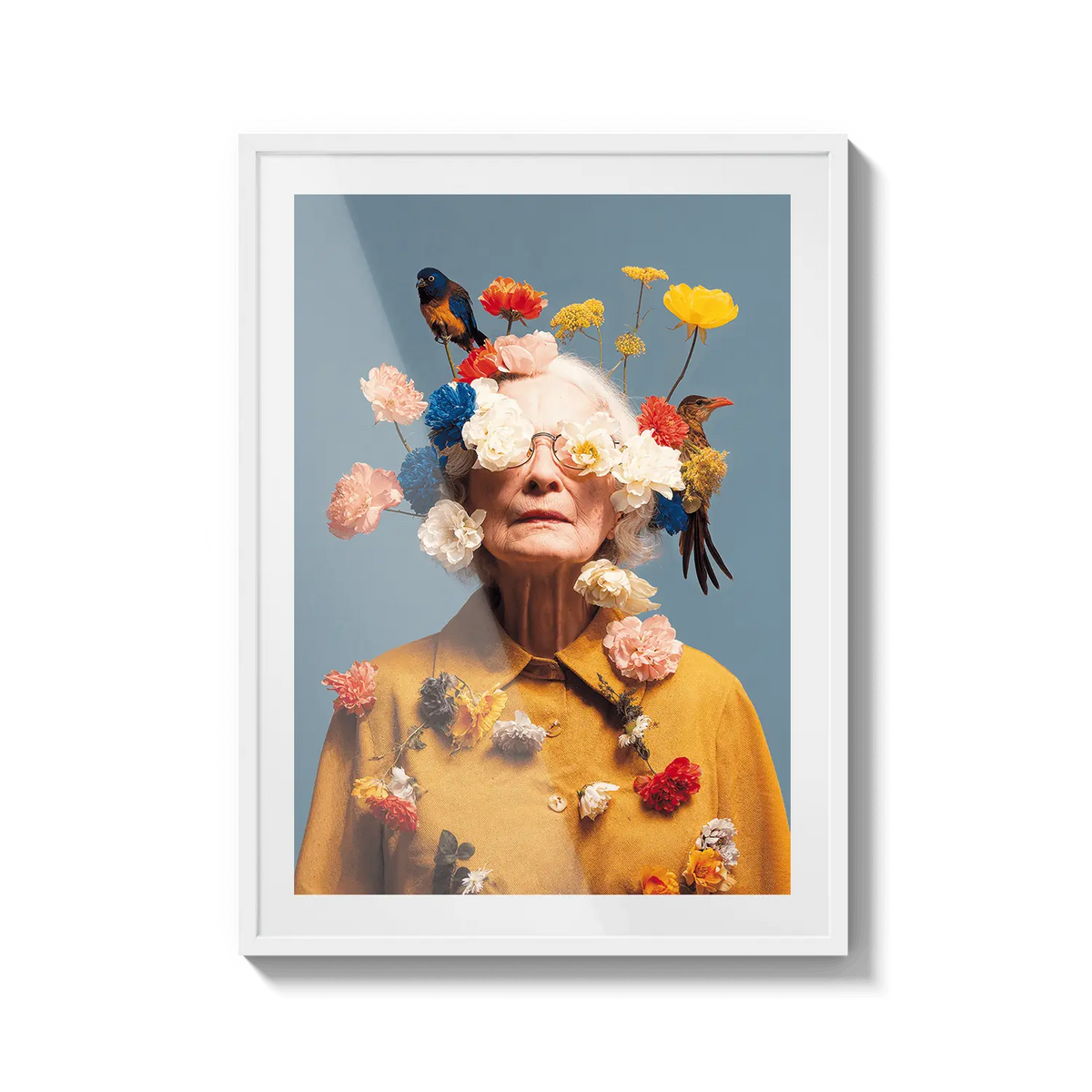 A portrait of an older woman adorned with blooming flowers, celebrating beauty, wisdom and grace. A thoughtful and uplifting gesture.