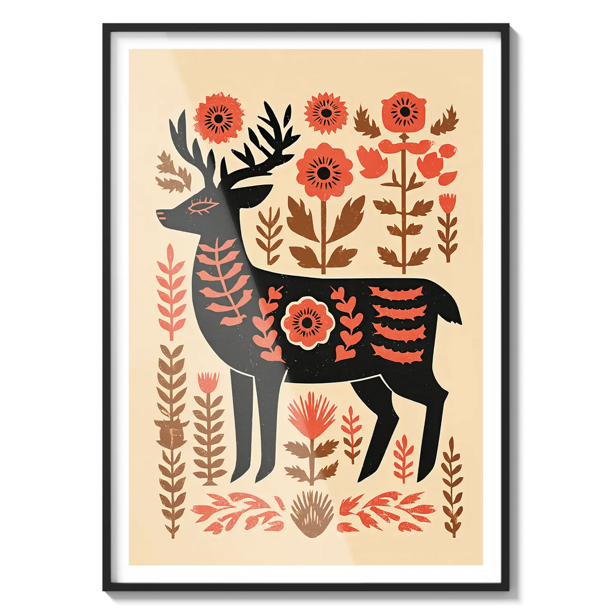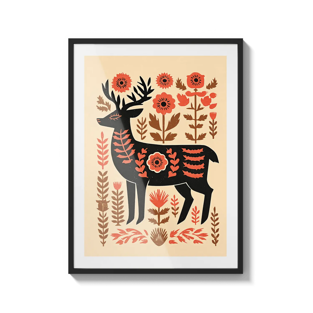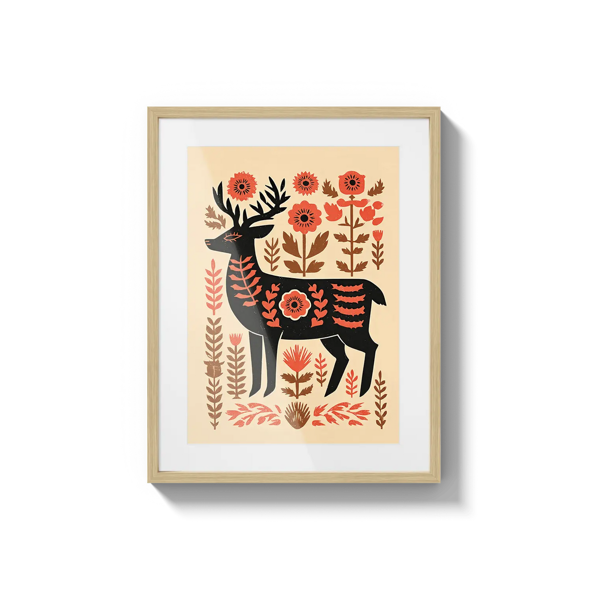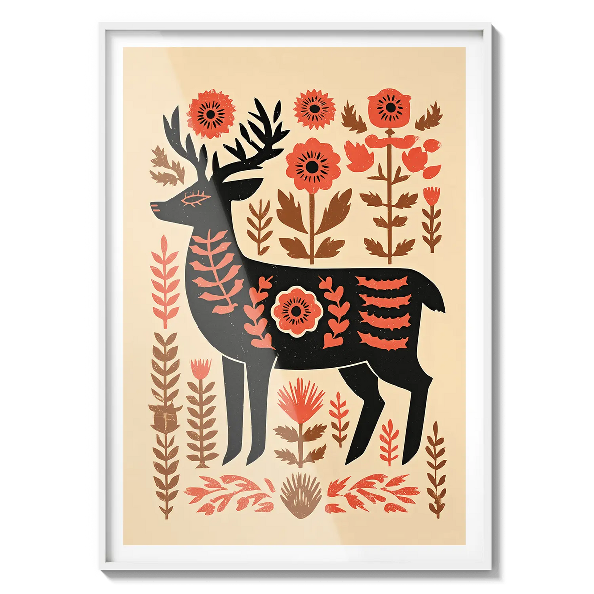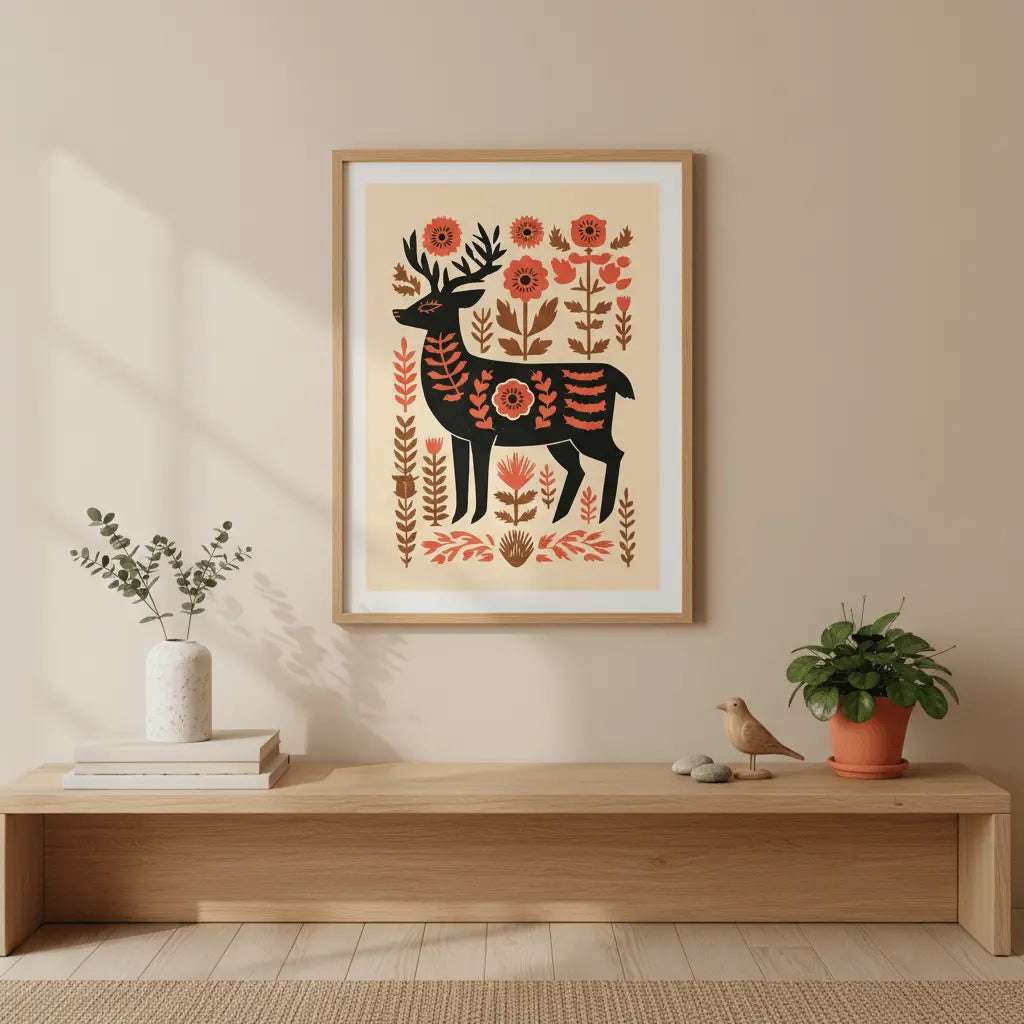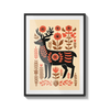 A stylized deer stands among warm floral shapes, blending folk art charm with gentle natural tones. This artwork feels thoughtful and warm, a kind gesture for someone who appreciates simplicity and quiet beauty.