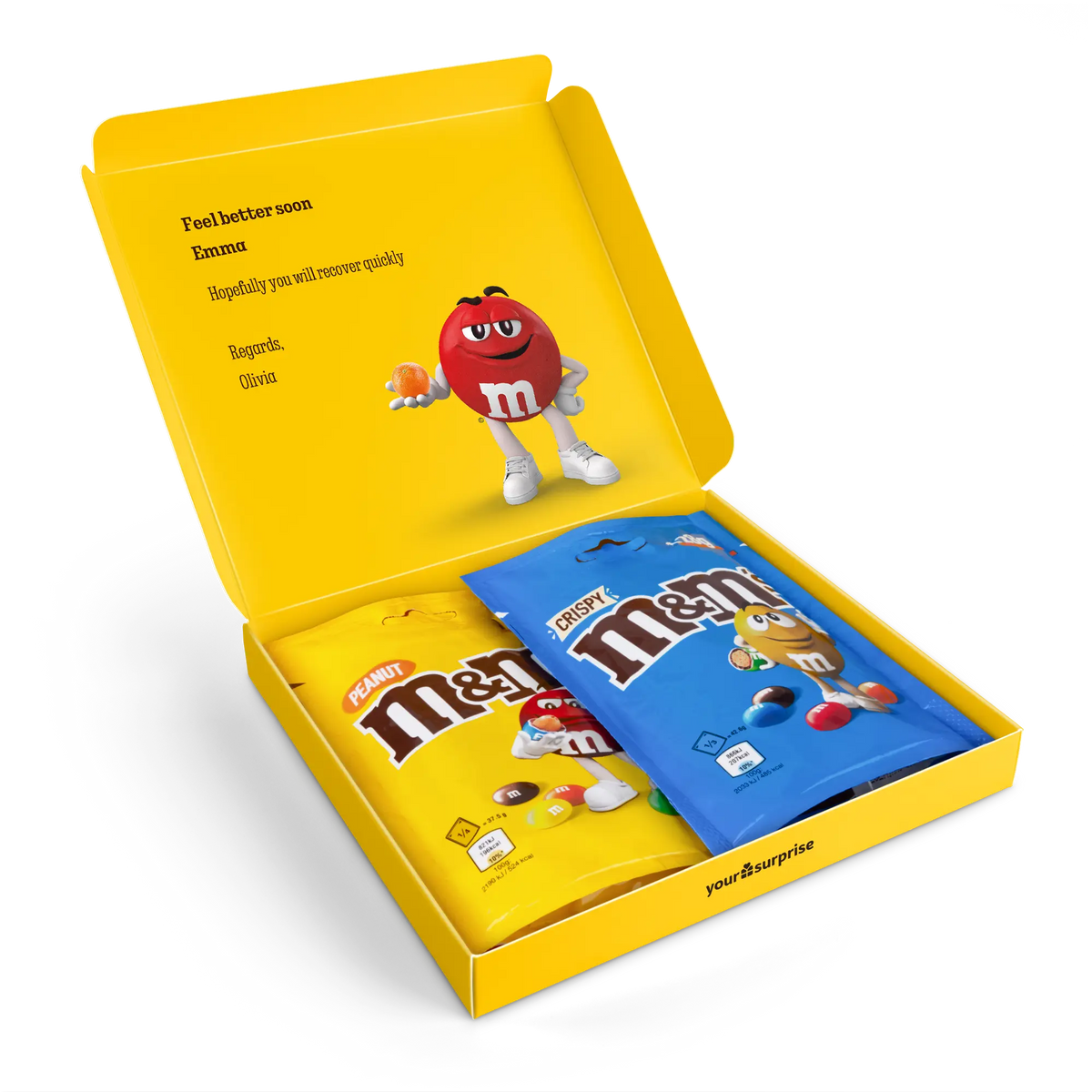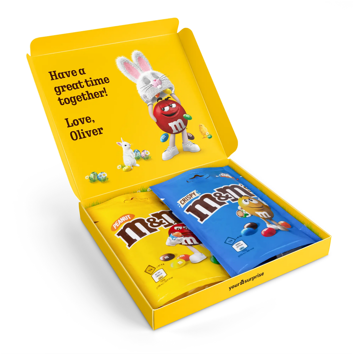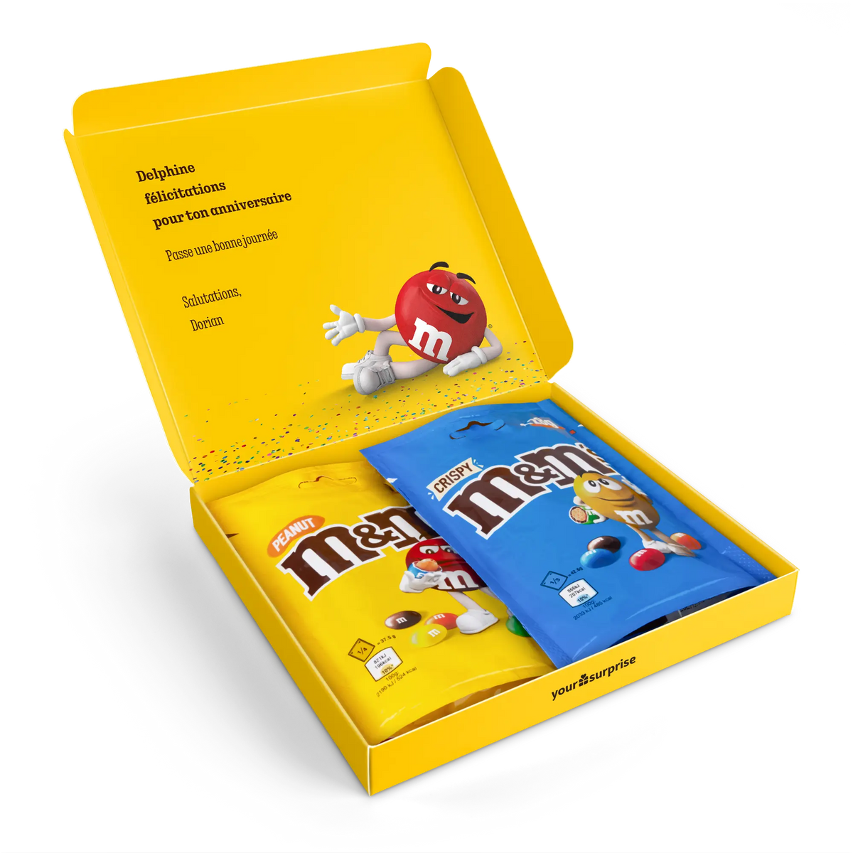 More information about the M&M's gift box:Content: 2 bagsFlavours: one bag of M&M's Crispy (107 grams), one bag of M&M's Peanut (125 grams)Dimensions: 19.50 x 18 x 2 cmCustomisation: with name, photo or logo and messagePrinting: clear and full colourIngredients of M&M'S Crispy 107g: Sugar, cocoa butter, skimmed milk powder, cocoa mass, butterfat (from milk ), lactose , buttermilk powder (from milk ), rice flour, whole milk powder , whole wheat flour, emulsifier ( soya lecithin , E471), malted wheat flour, starch, palm fat, shea butter, glucose syrup, salt, rapeseed oil, stabiliser (gum arabic), colouring agents (E100, E133, E160a, E162, E170, E172), dextrin, glazing agent (carnauba wax), natural vanilla extract, palm kernel oil, flavouring.aLLERGENS: May contain traces of peanuts, hazelnuts and almonds.Ingredients of M&M'S Peanut 125g: Sugar, cocoa butter, skimmed milk powder, cocoa mass, peanuts , butterfat (from milk ), lactose , whey powder (from milk ), whole milk powder , emulsifier ( soya lecithin ), starch, palm fat, shea butter, glucose syrup, salt, stabiliser (gum arabic), colouring agents (E100, E133, E160a, E162, E170, E172), dextrin, glazing agent (carnauba wax), natural vanilla extract, palm kernel oil, flavouring.aLLERGENS: May contain traces of almond, hazelnut and wheat.Important to know: with temperatures above 25 degrees Celsius, we cannot guarantee that you will receive your chocolate gift in perfect condition. Questions? Unfortunately, for technical reasons, it is not possible to process numbers, Cyrillic, Turkish or special characters.