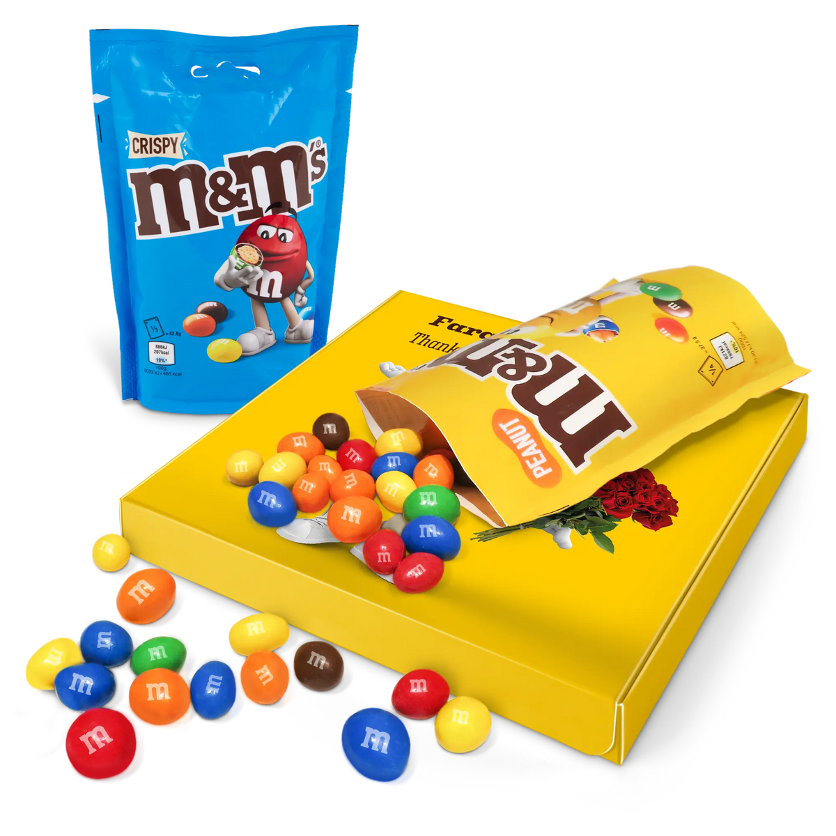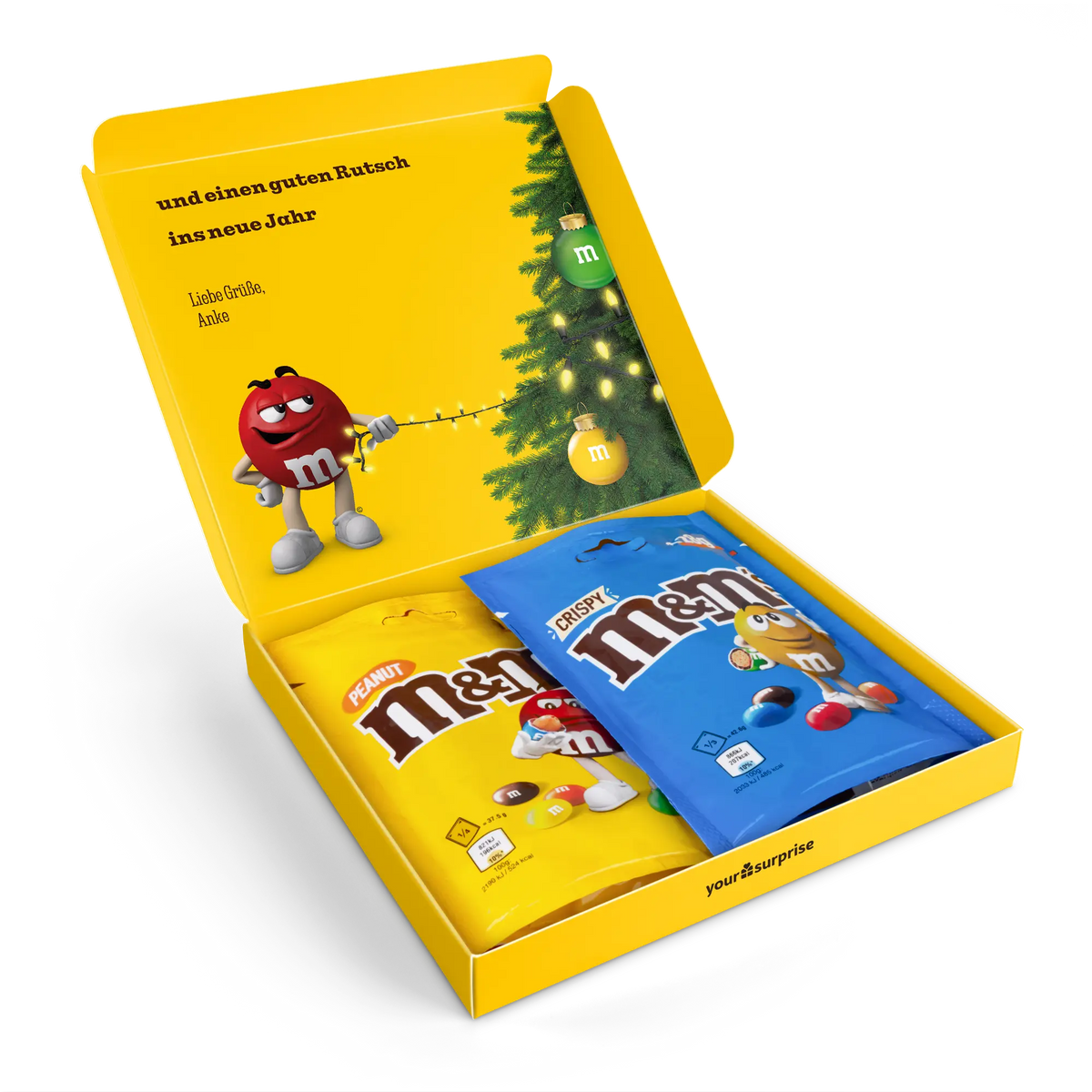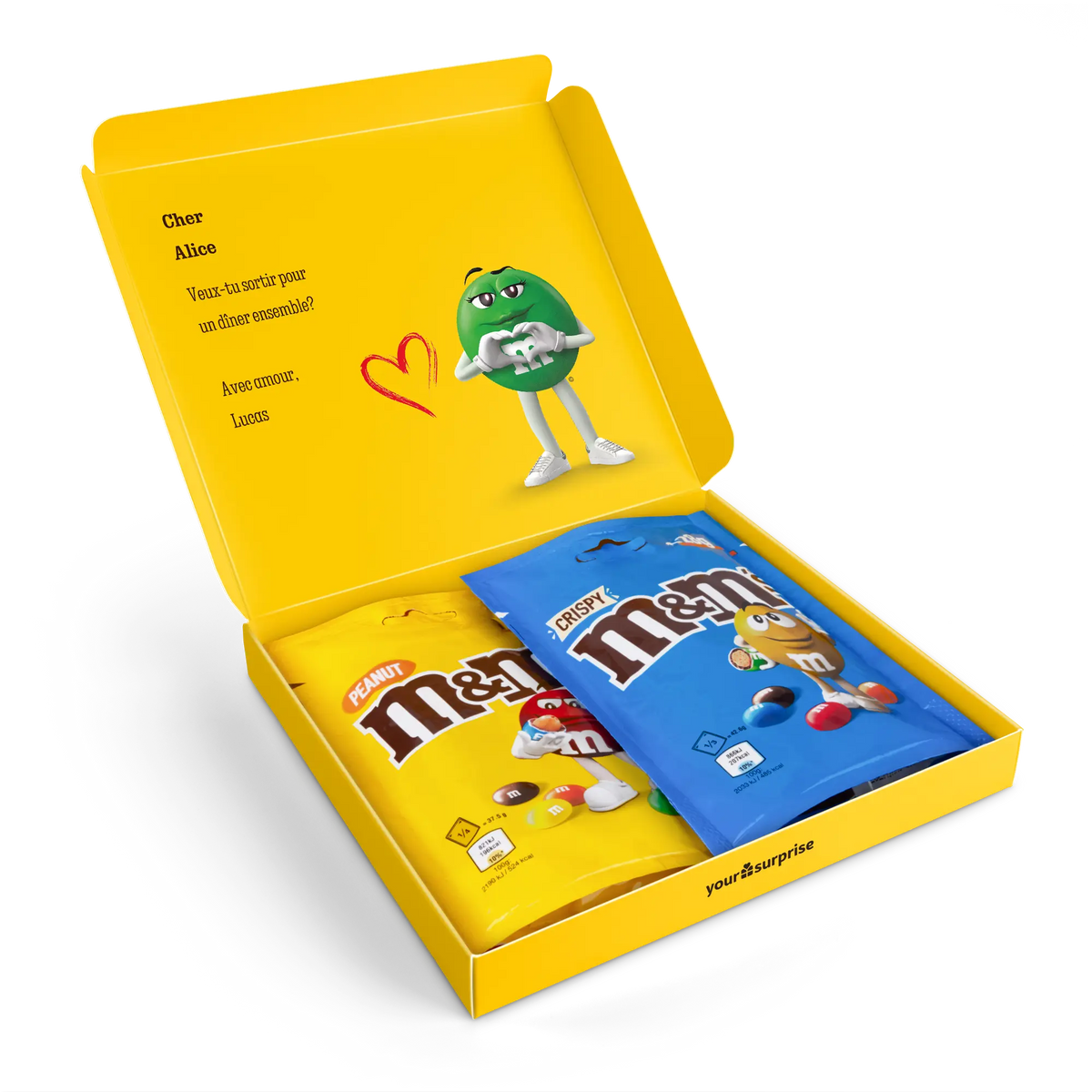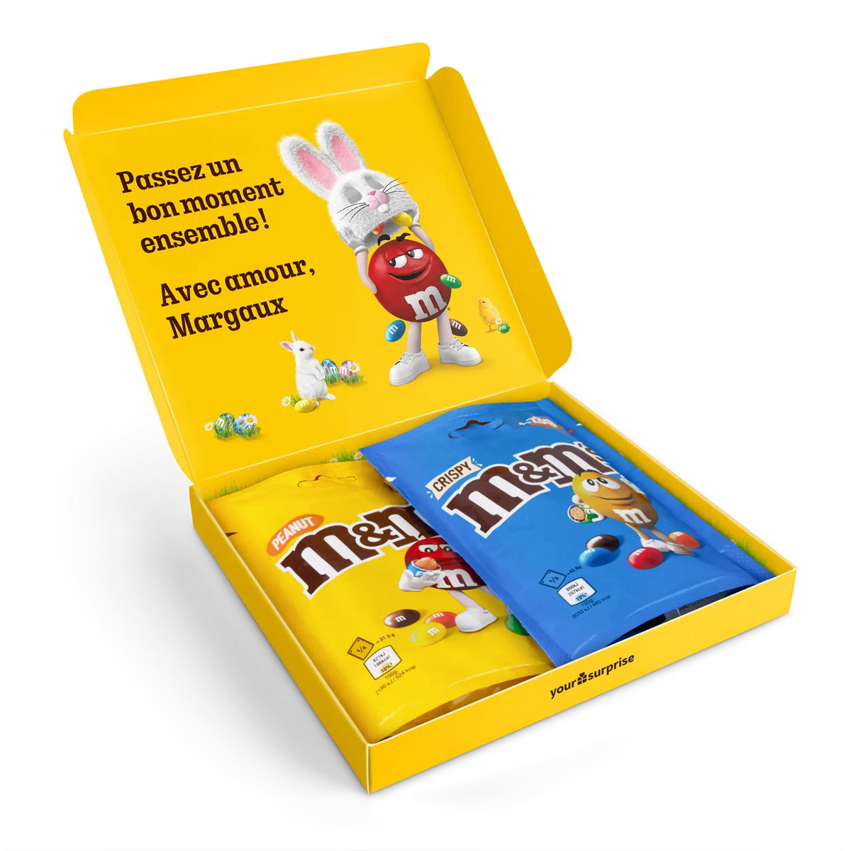 More information about the M&M's gift box:Content: 2 bagsFlavours: one bag of M&M's Crispy (107 grams), one bag of M&M's Peanut (125 grams)Dimensions: 19.50 x 18 x 2 cmCustomisation: with name, photo or logo and messagePrinting: clear and full colourIngredients of M&M'S Crispy 107g: Sugar, cocoa butter, skimmed milk powder, cocoa mass, butterfat (from milk ), lactose , buttermilk powder (from milk ), rice flour, whole milk powder , whole wheat flour, emulsifier ( soya lecithin , E471), malted wheat flour, starch, palm fat, shea butter, glucose syrup, salt, rapeseed oil, stabiliser (gum arabic), colouring agents (E100, E133, E160a, E162, E170, E172), dextrin, glazing agent (carnauba wax), natural vanilla extract, palm kernel oil, flavouring.aLLERGENS: May contain traces of peanuts, hazelnuts and almonds.Ingredients of M&M'S Peanut 125g: Sugar, cocoa butter, skimmed milk powder, cocoa mass, peanuts , butterfat (from milk ), lactose , whey powder (from milk ), whole milk powder , emulsifier ( soya lecithin ), starch, palm fat, shea butter, glucose syrup, salt, stabiliser (gum arabic), colouring agents (E100, E133, E160a, E162, E170, E172), dextrin, glazing agent (carnauba wax), natural vanilla extract, palm kernel oil, flavouring.aLLERGENS: May contain traces of almond, hazelnut and wheat.Important to know: with temperatures above 25 degrees Celsius, we cannot guarantee that you will receive your chocolate gift in perfect condition. Questions? Unfortunately, for technical reasons, it is not possible to process numbers, Cyrillic, Turkish or special characters.