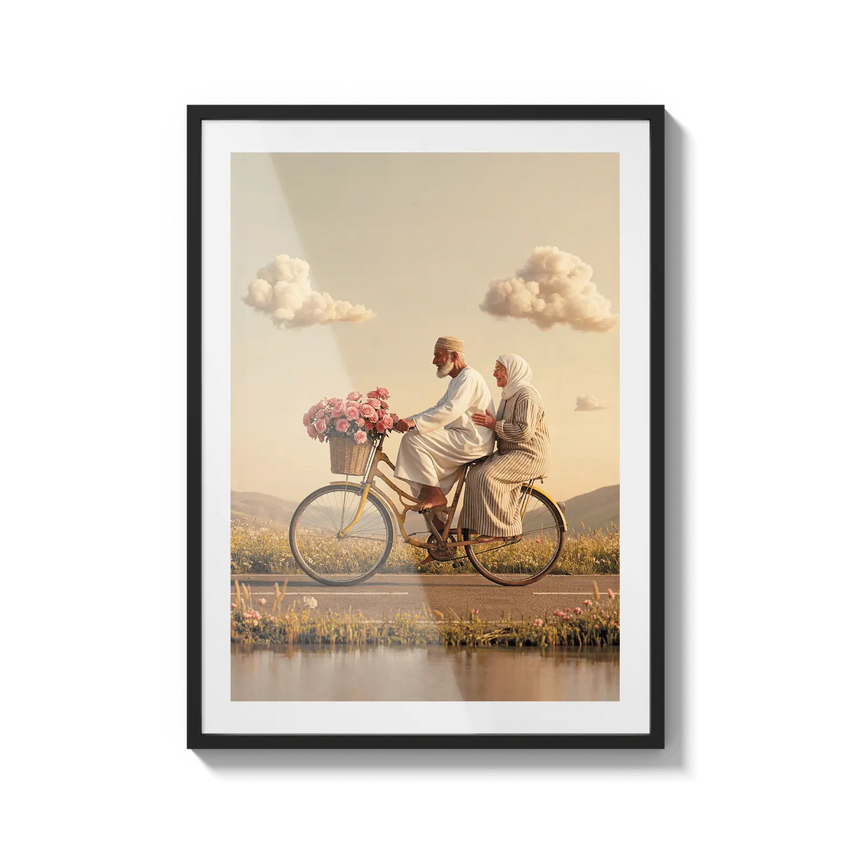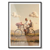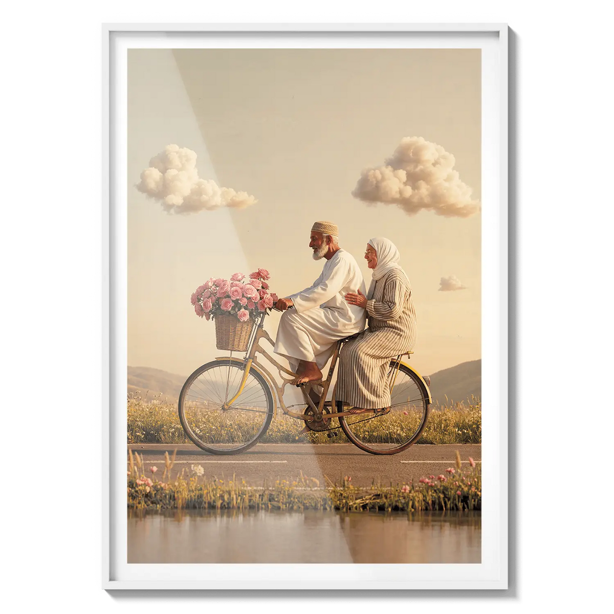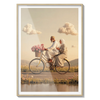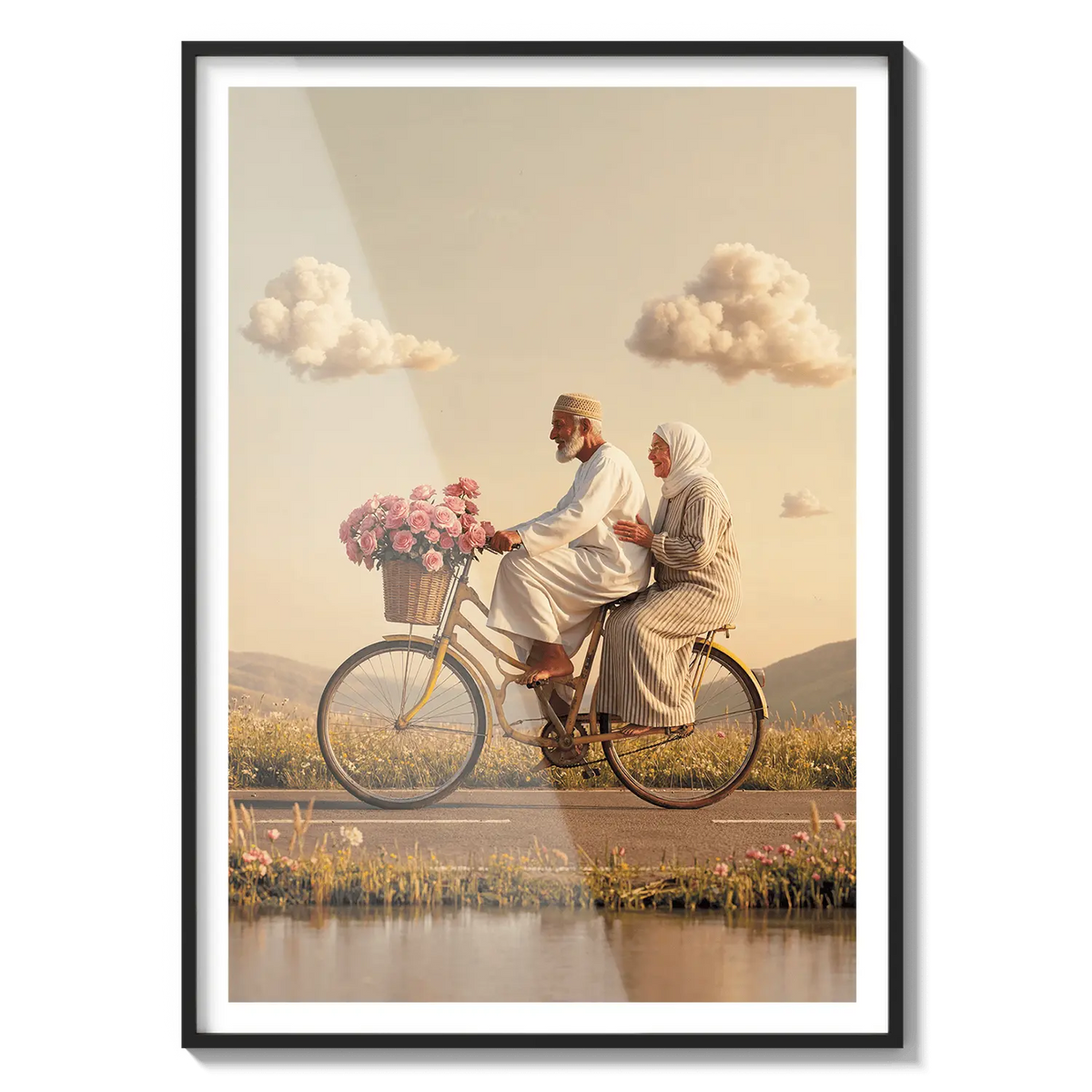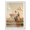 A couple riding a bicycle through golden light, evoking companionship and joy. A sweet artwork to celebrate shared moments.