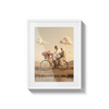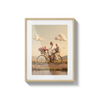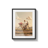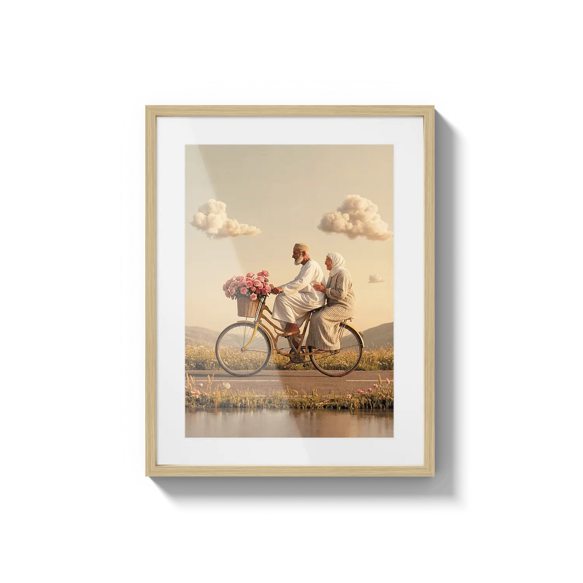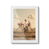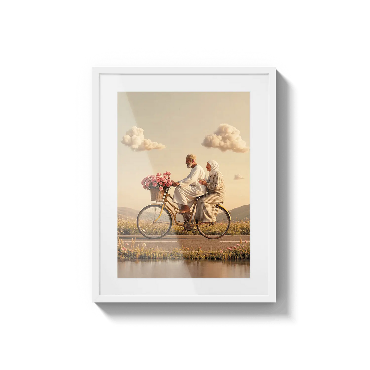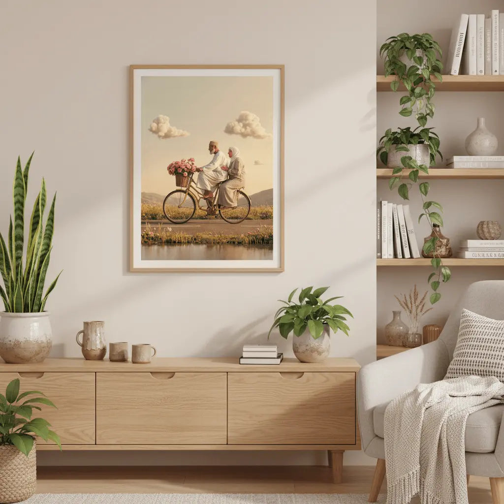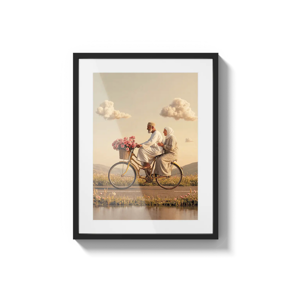 A couple riding a bicycle through golden light, evoking companionship and joy. A sweet artwork to celebrate shared moments.