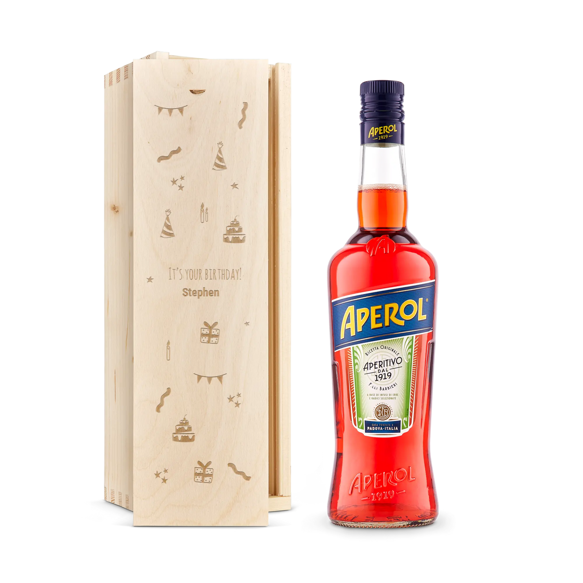 Surprinde pe cineva drag cu o sticlă de Aperol prezentată într-o cutie din lemn personalizată, gravată cu numele și/sau mesajul ales de tine. Un cadou rafinat, perfect pentru aniversări, ocazii speciale sau surprize elegante.