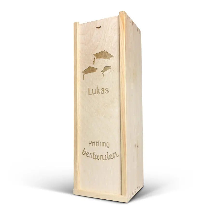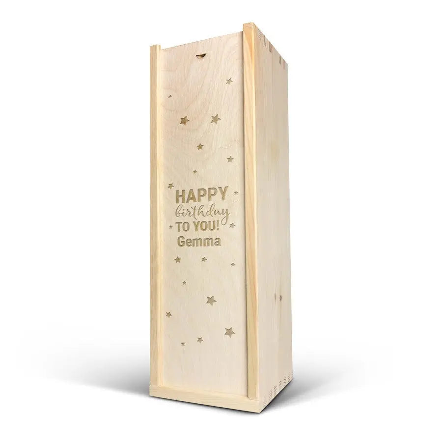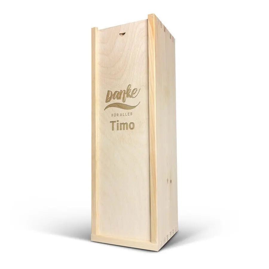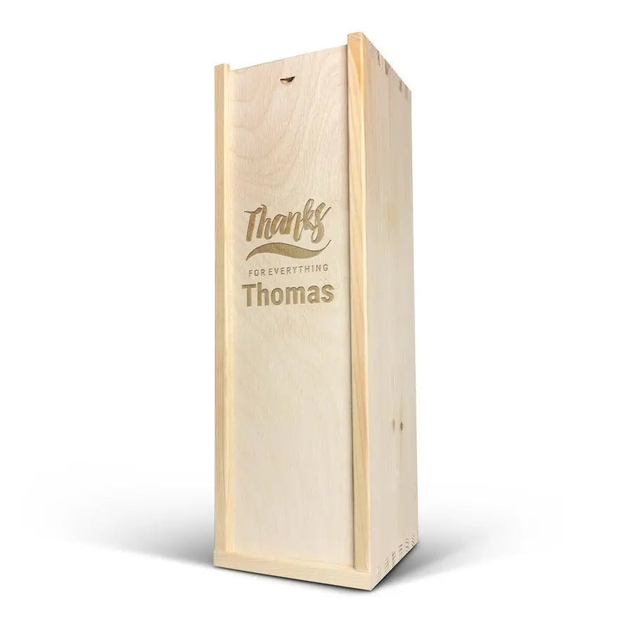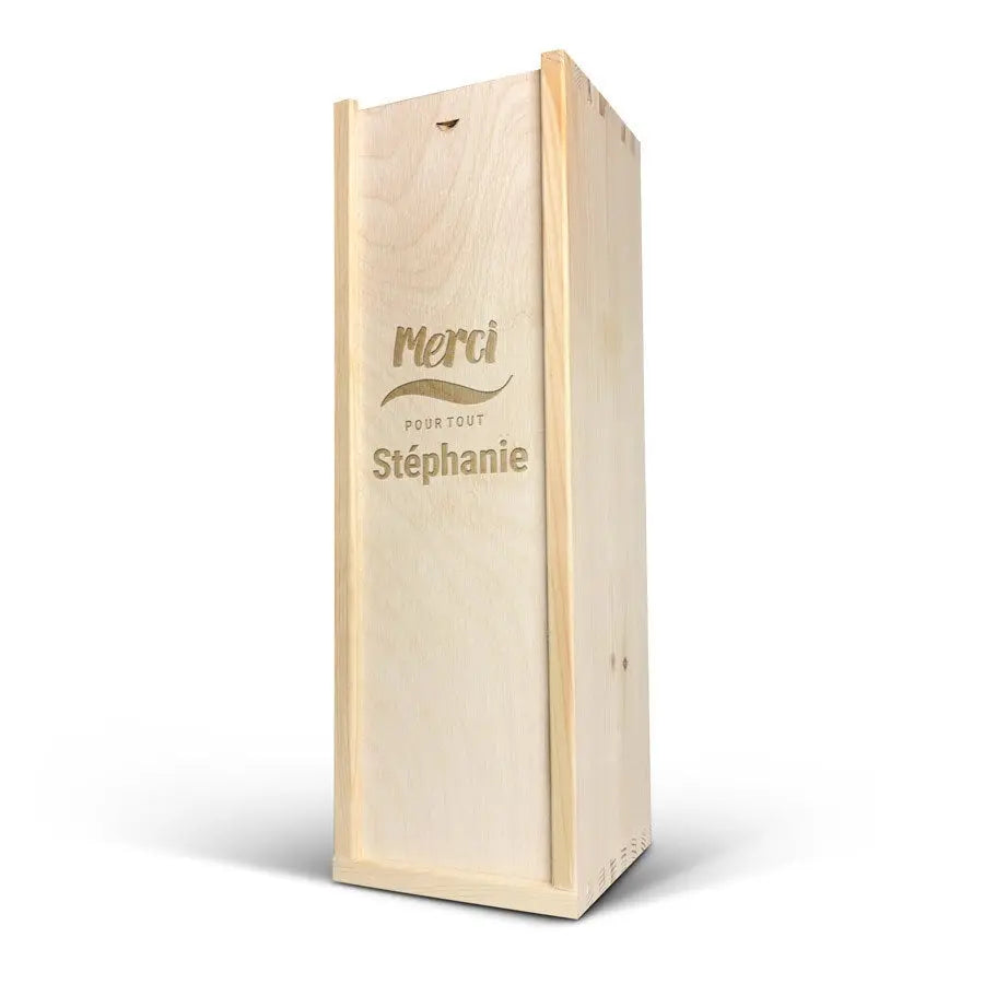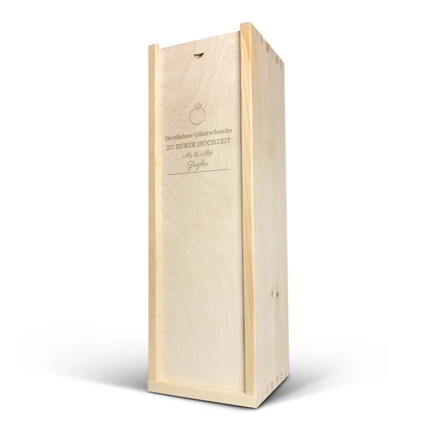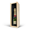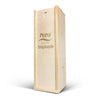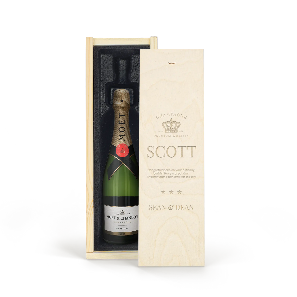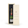 A delicious bottle of Moët & Chandon champagne in an engraved wooden case with your name or text.