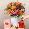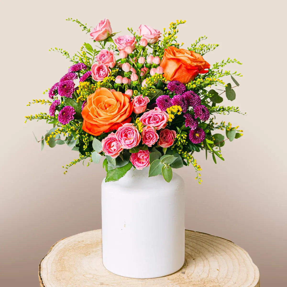 This bouquet is a beautiful combination of orange roses, santine chrysanthemums and snowball roses. A perfect gift for the most special person.