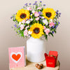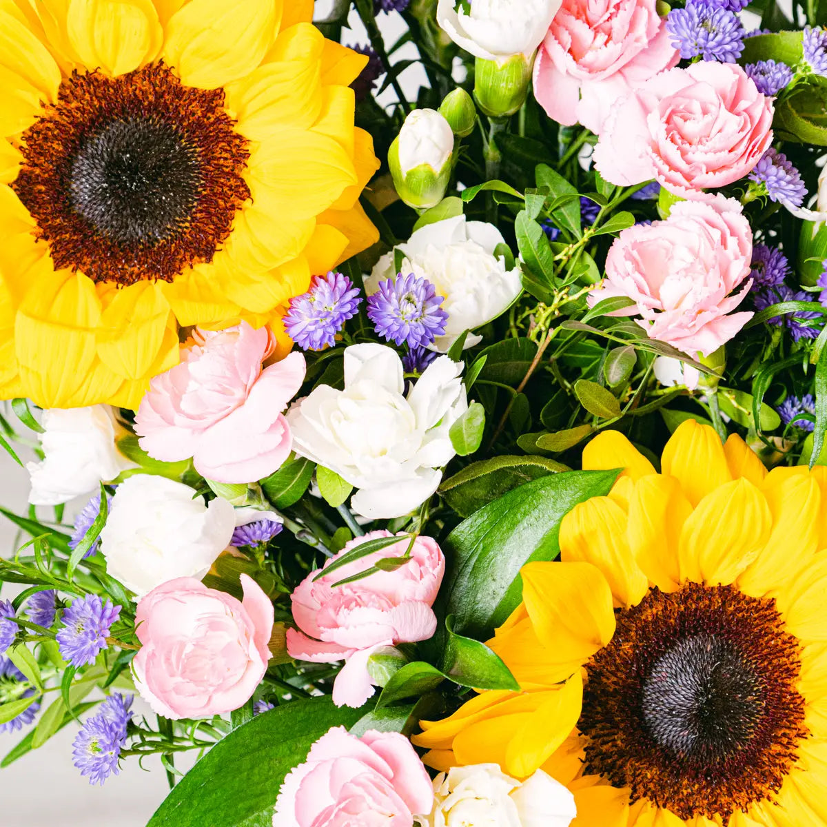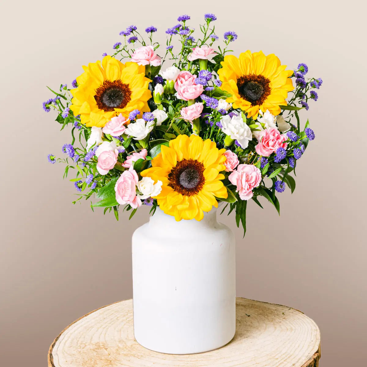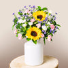 Invite that special someone to experience a colourful sunset in their living room. Thanks to the yellow of the sunflower, the purple of the limonium and the reddish hue of the lentiscus, our Vibrant Sunset bouquet evokes a beautiful summer sunset.
