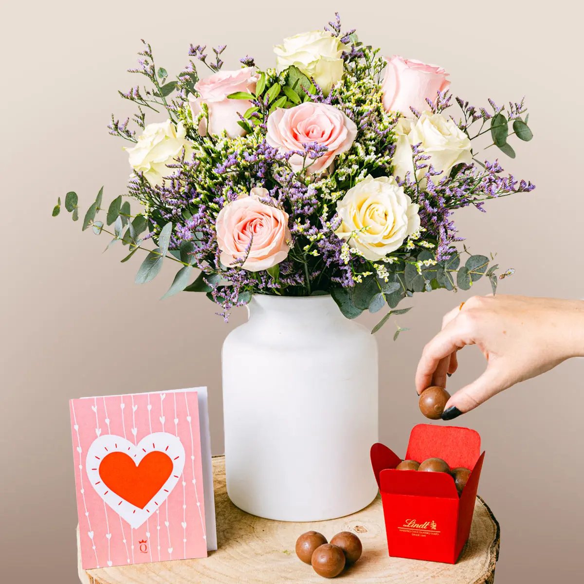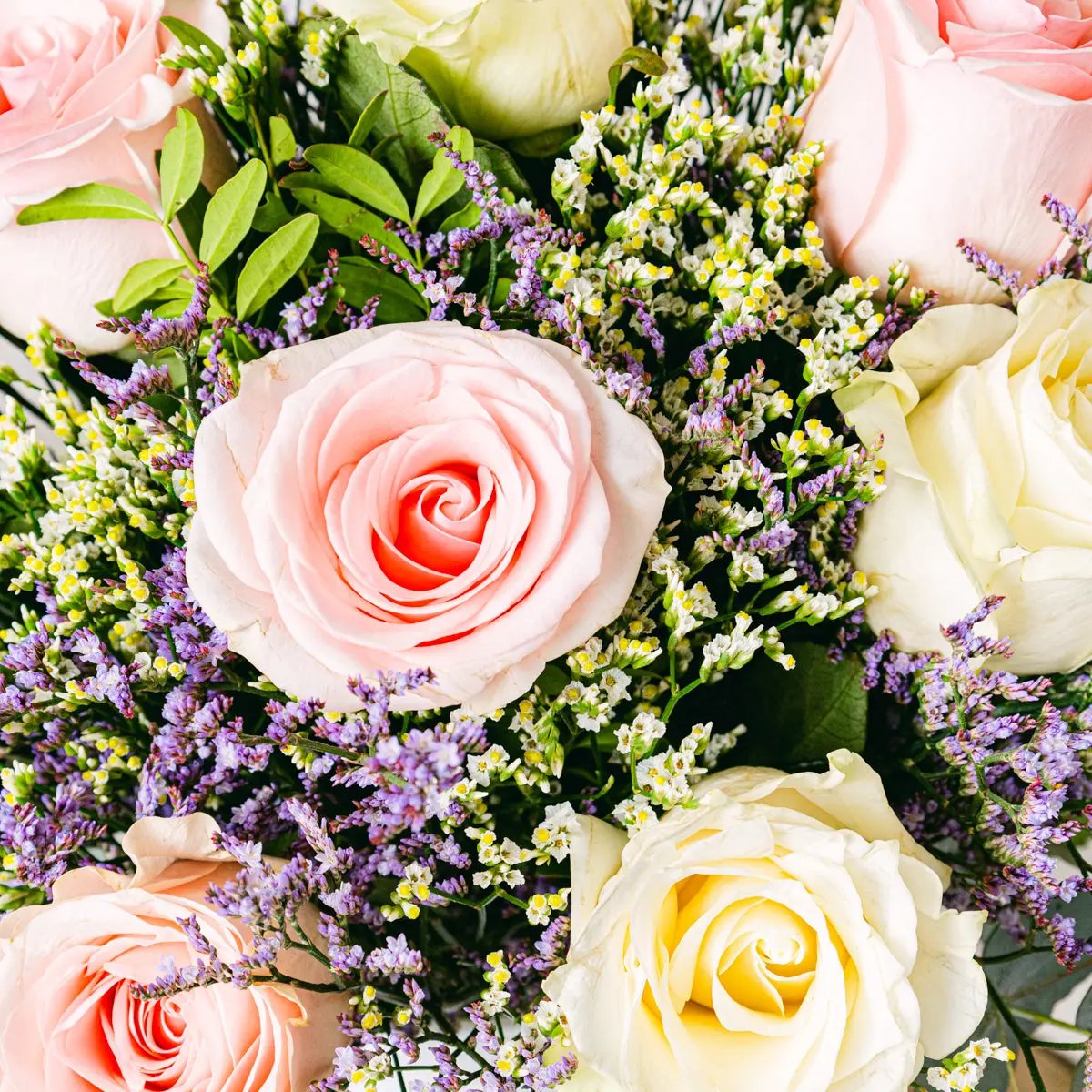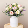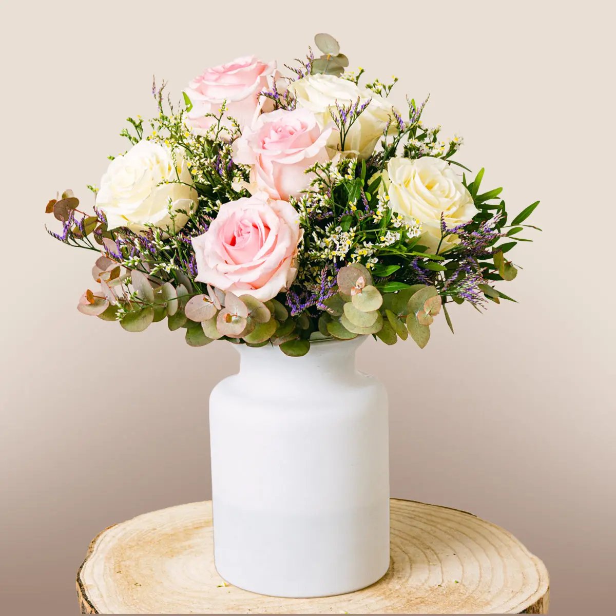 The fresh aroma of the eucalyptus creates a purifying bouquet that helps everyone around to breathe deeply. The arrangement of roses in relaxed white and pink tones evokes calm and invites you to take in everything around you, including the barely noticeable sounds of your body working, of plants growing in harmony with the sun, and of birds moving with the wind.