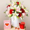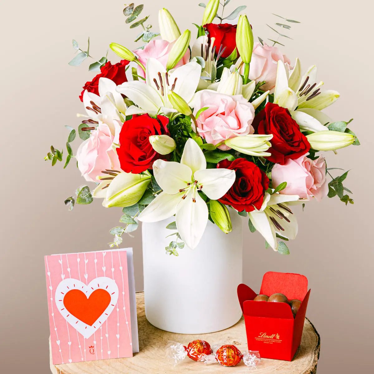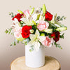 This arrangement of roses and lilies could be the dessert to accompany your favourite meal. The roses’ red and pink tones create a delicious, soft contrast with the white of the lilies. The perfect bouquet to send a comforting message, reminding them that you’ll always be at their side.