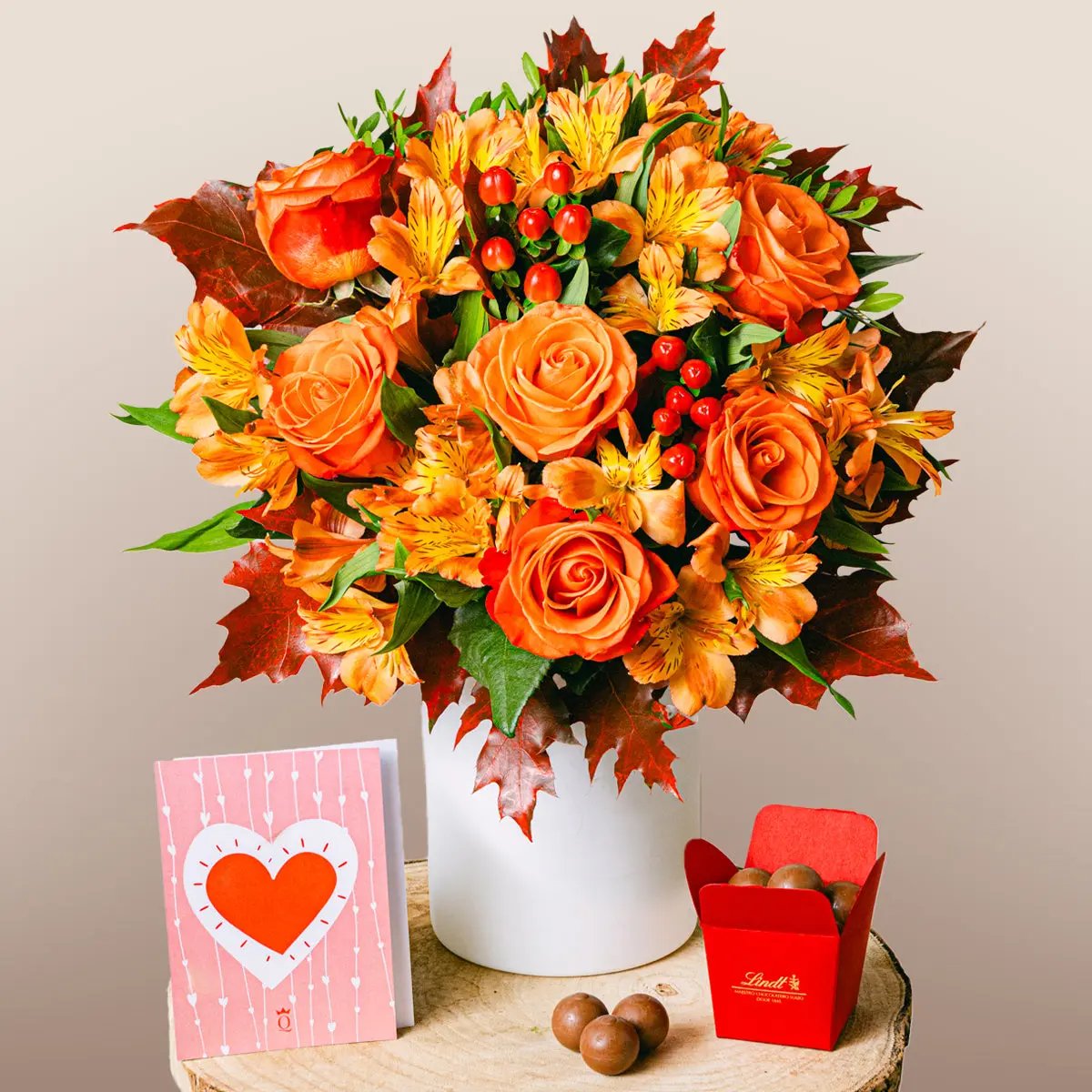 Is there anything that represents this time of year better than the pumpkin? This fruit inspired us to create a bouquet of orange roses and alstroemerias, combined with oak leaves and hypericum. Choose a bouquet that gives off all the magic of the season as the perfect surprise to send to a loved one.