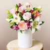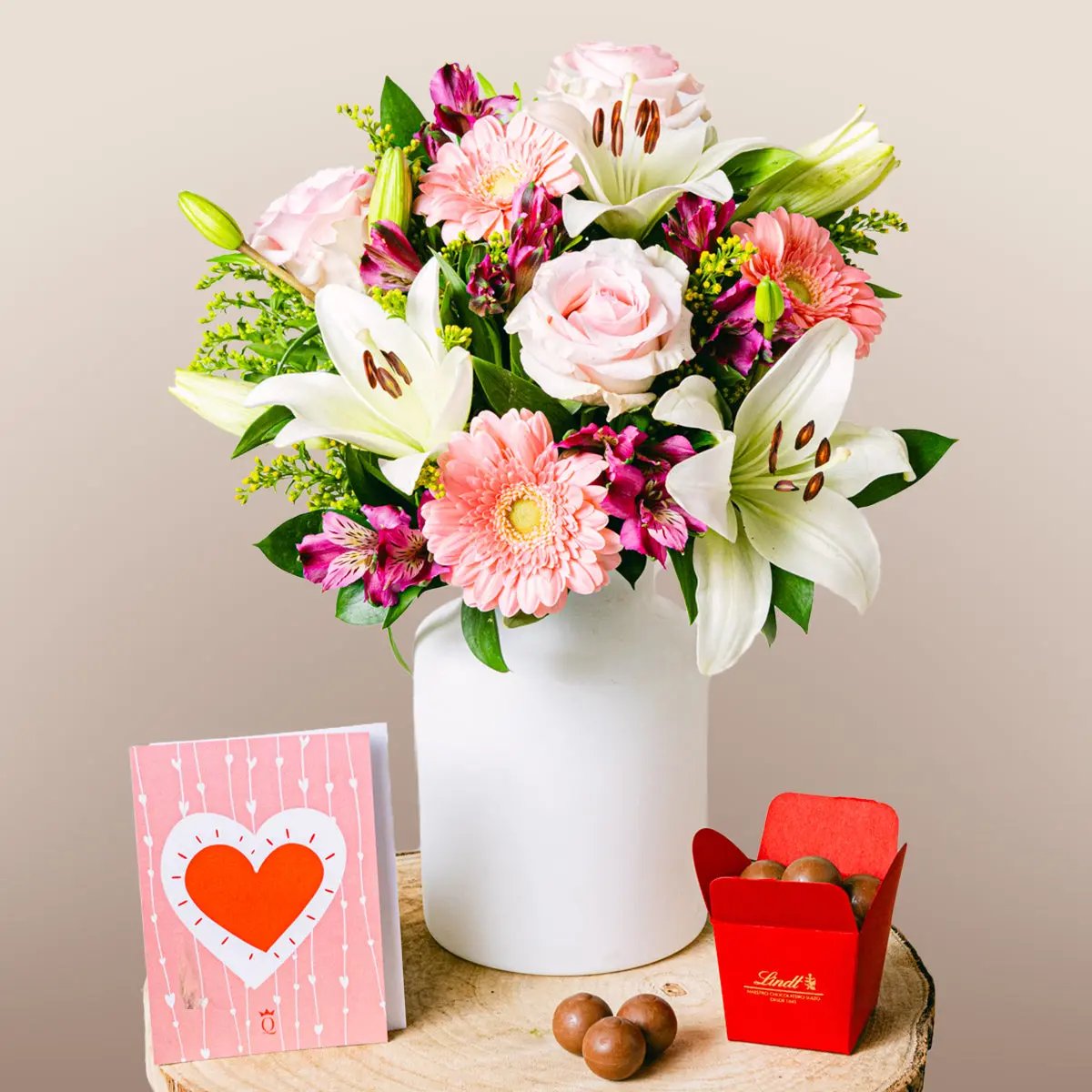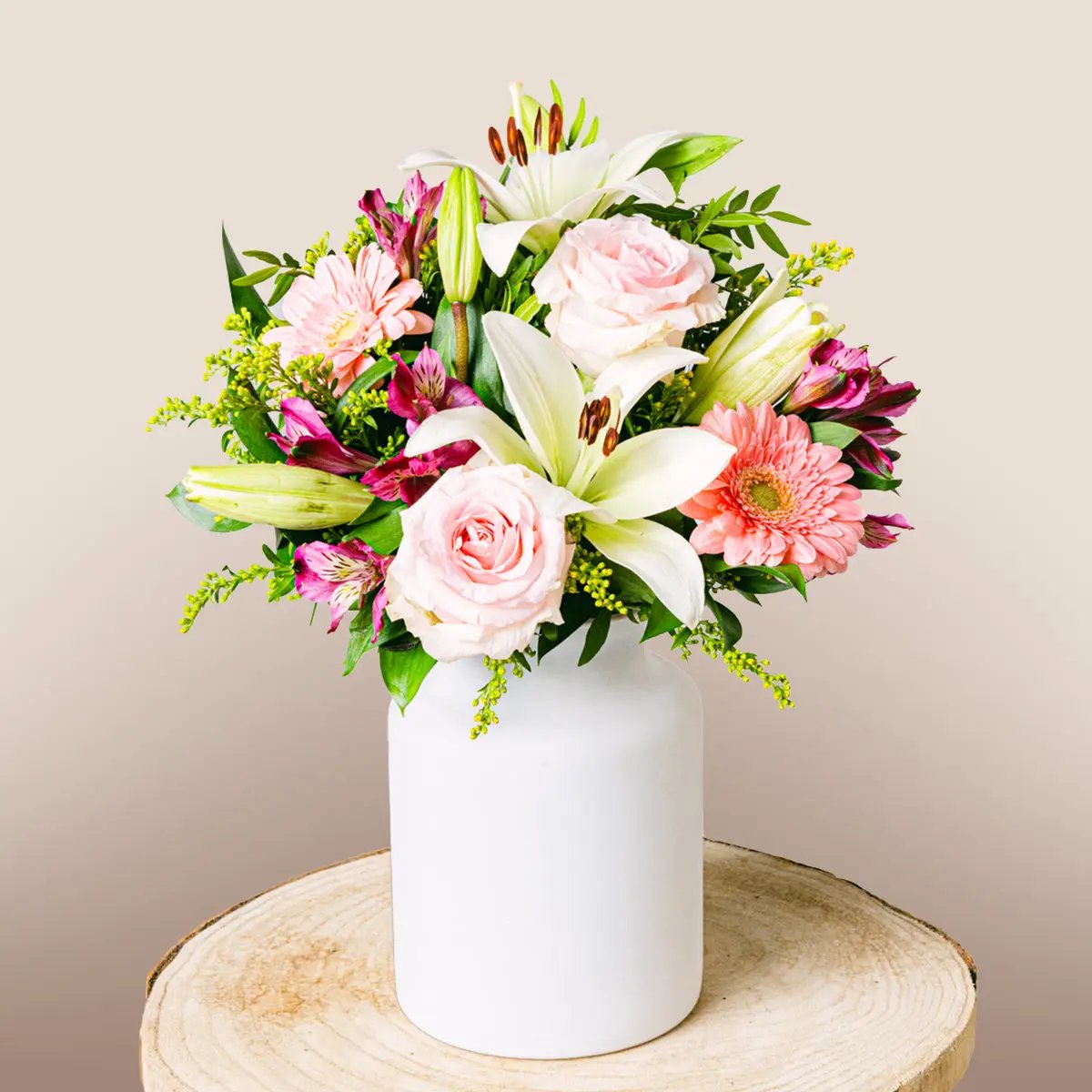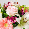 With variety comes beauty, and the proof lies in this arrangement of gerberas, lilies, roses, and alstroemerias in white, pink and purple tones. Welcome to the dream world of this fabulous bouquet with a mystical aura.