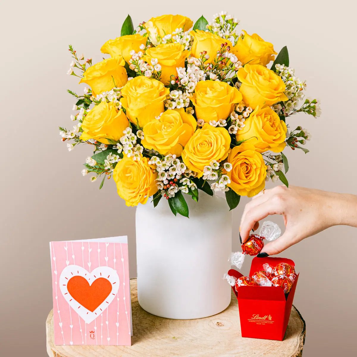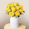 Just like that person who instantly makes everything okay, this bouquet will brighten up the grayest of days. A luminous arrangement with yellow roses sprinkled with white wax flower, with contrasting ruscus and lentiscus to add the freshest of touches.