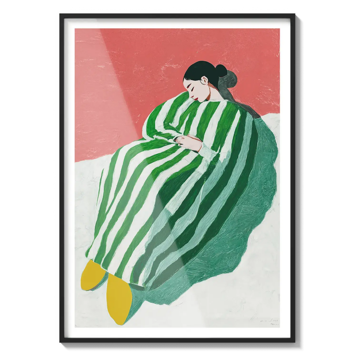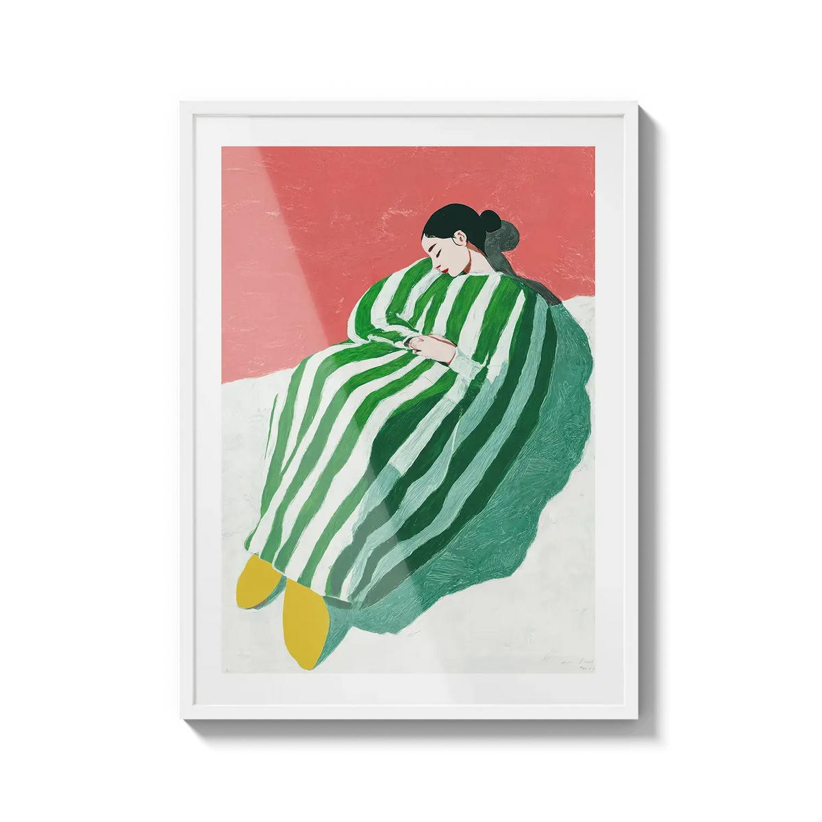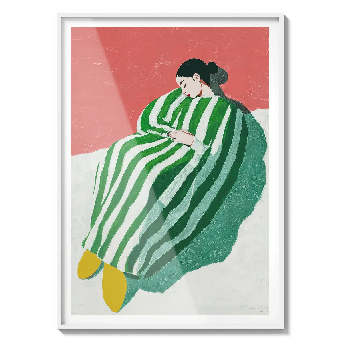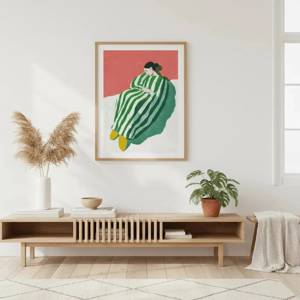 A figure wrapped in green and white stripes resting with quiet ease. A gentle invitation to slow down.