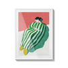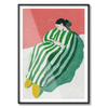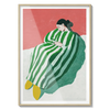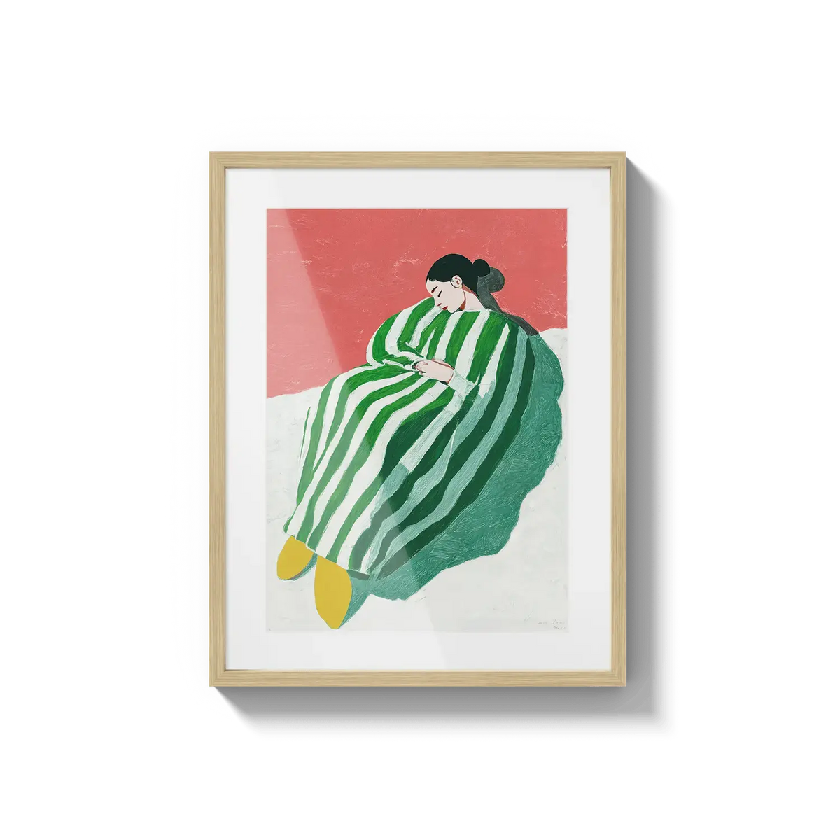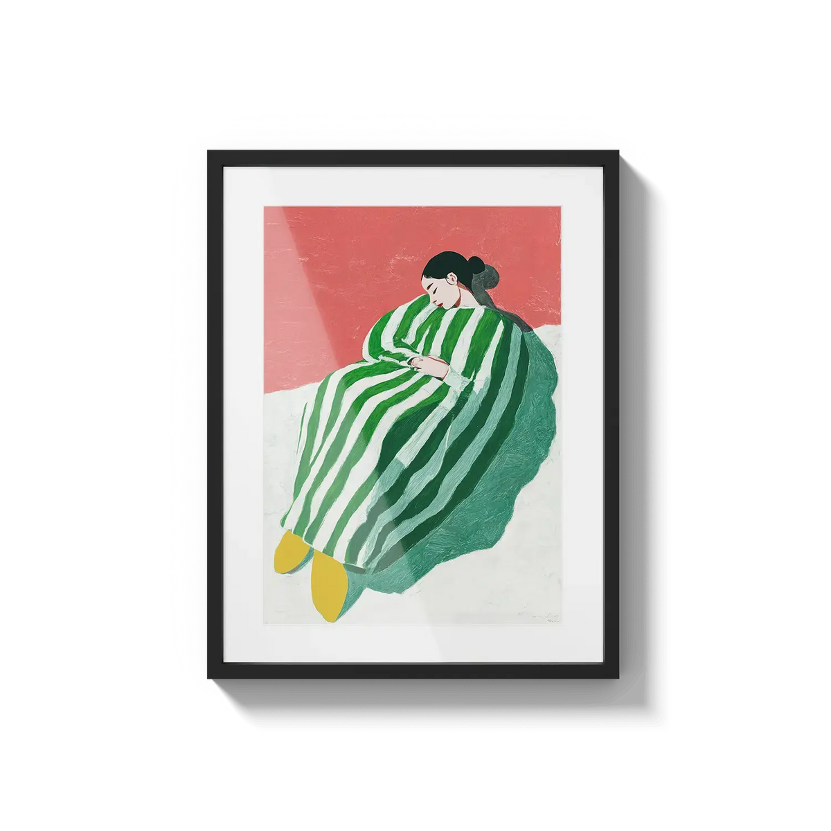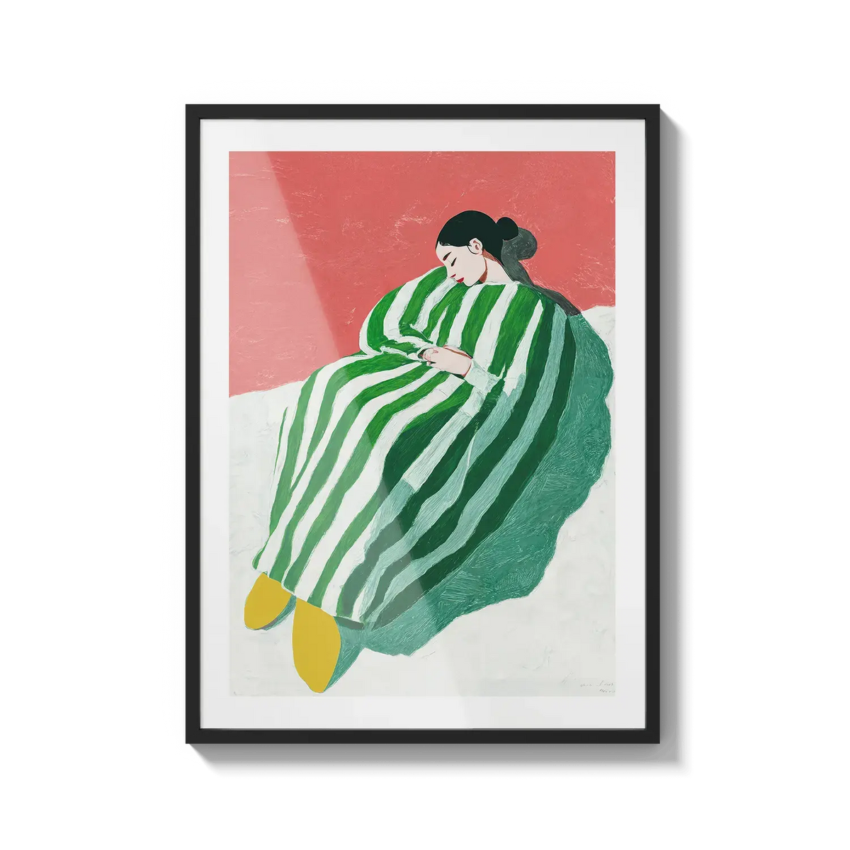 A figure wrapped in green and white stripes resting with quiet ease. A gentle invitation to slow down.