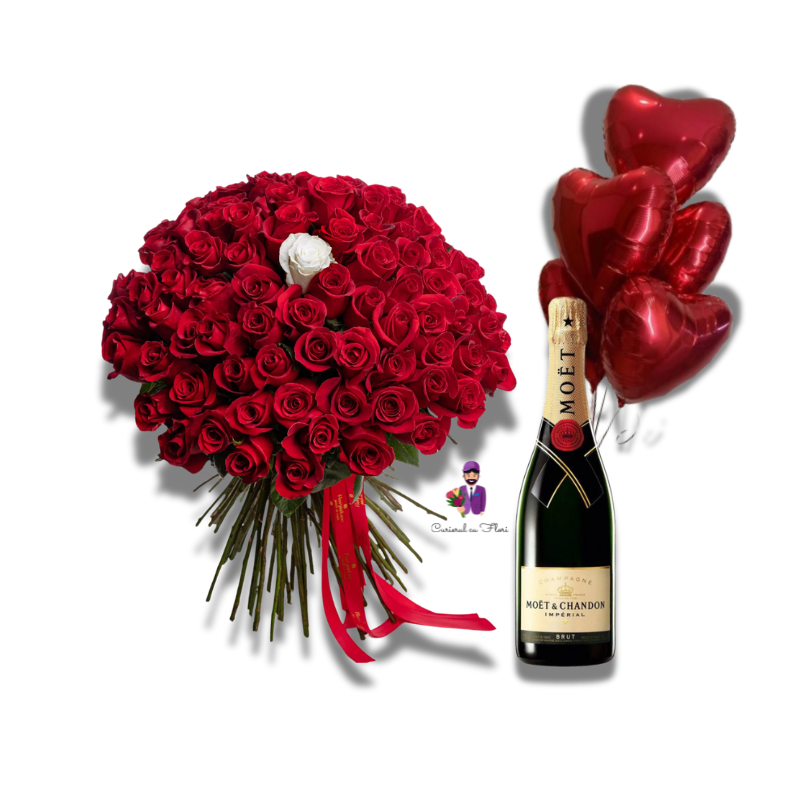 Transformă orice ocazie într-un moment special cu surpriza noastră exclusivă: 101 trandafiri superbi, o sticlă de Moet și baloane festive. Livrare rapidă la domiciliu pentru a aduce zâmbete și bucurie celor dragi.